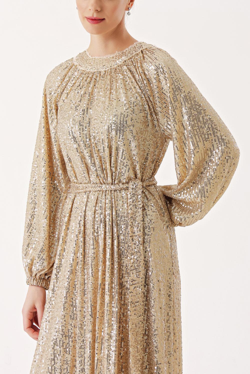 Bej Büzgü detaylı balon kollu payetli elbise 94468