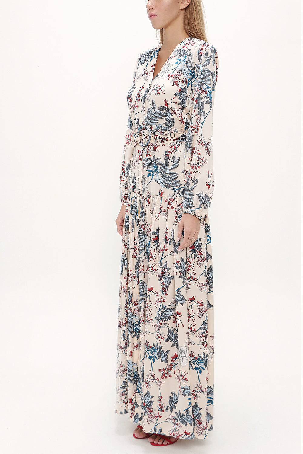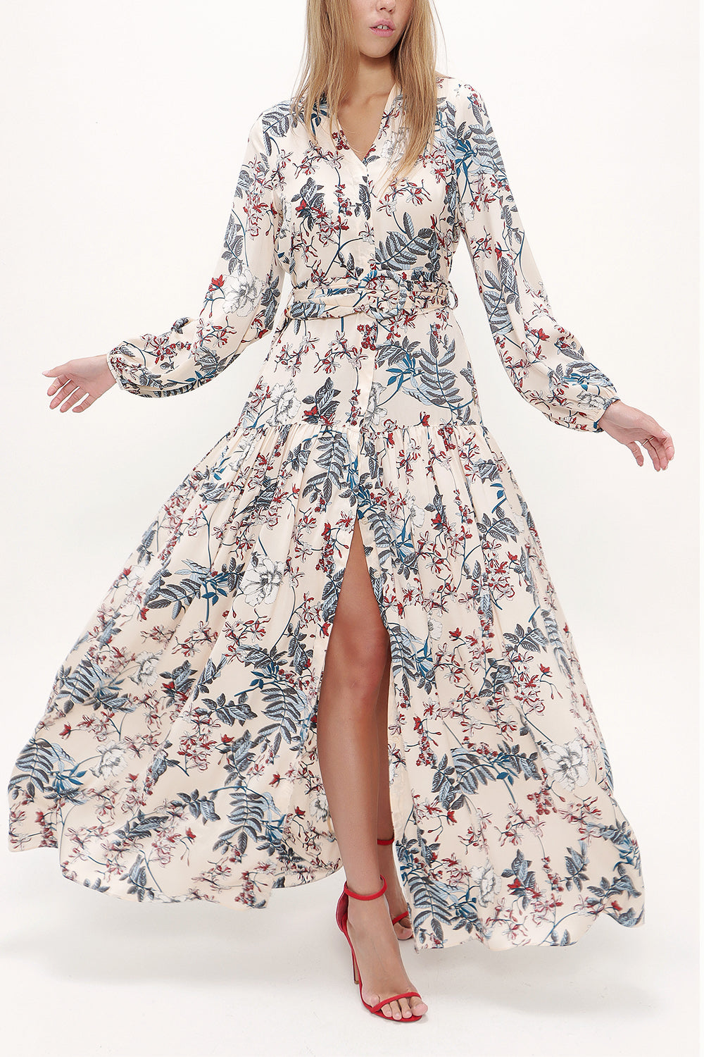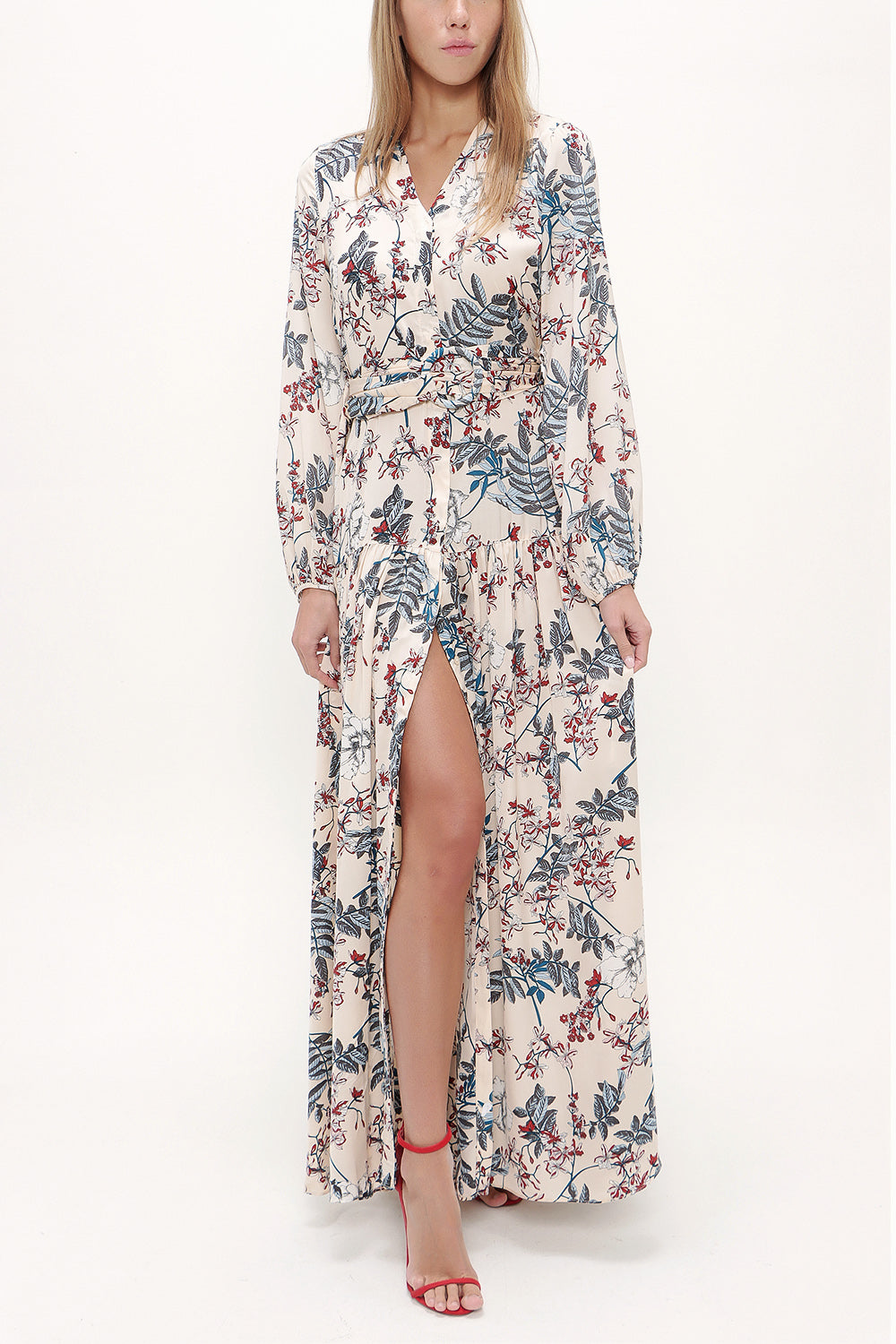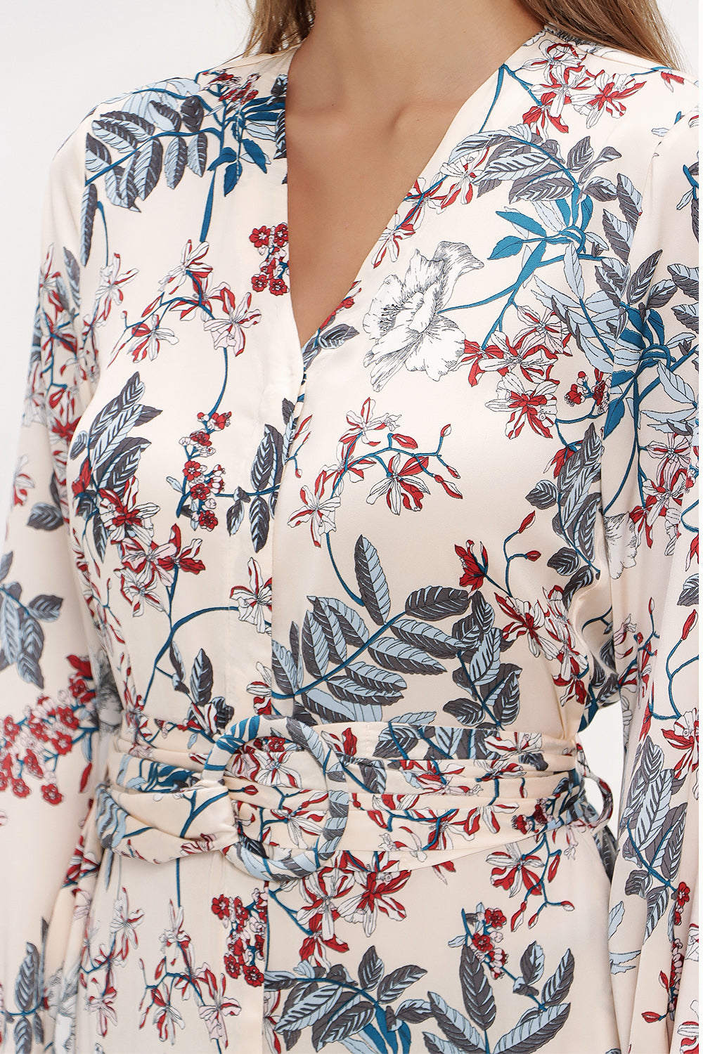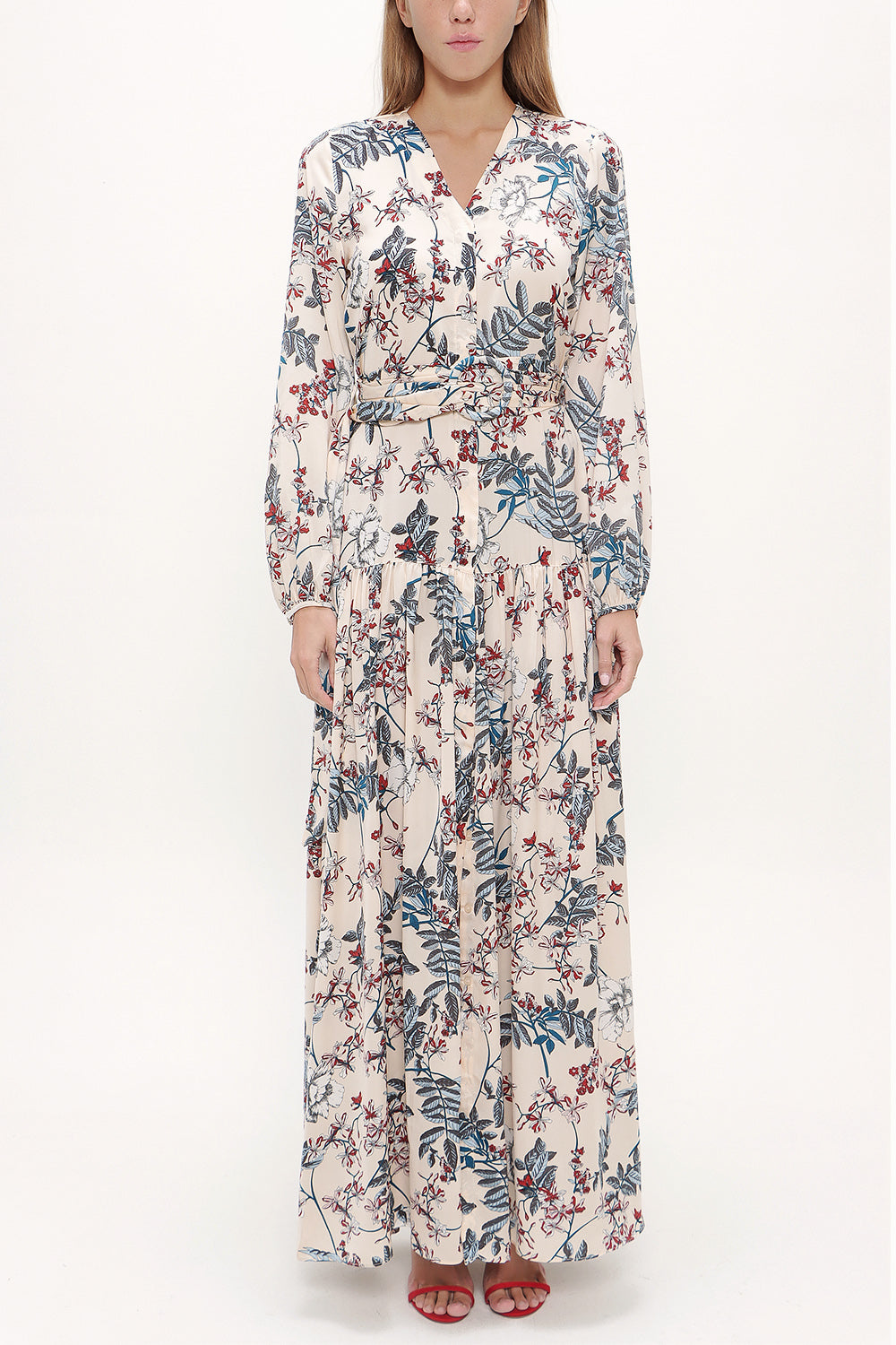 Bej V yaka uzun kemerli uzun elbise 92886