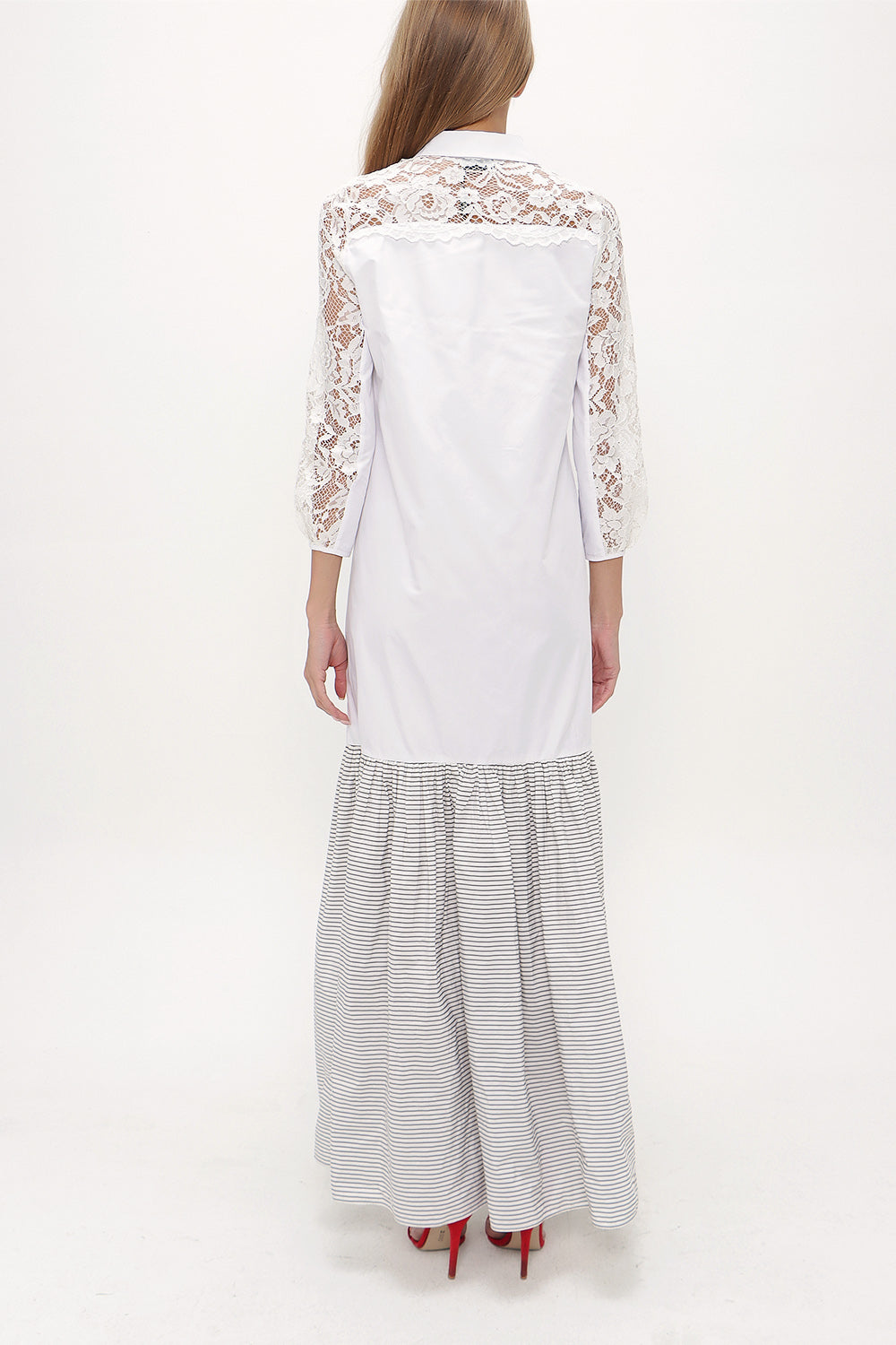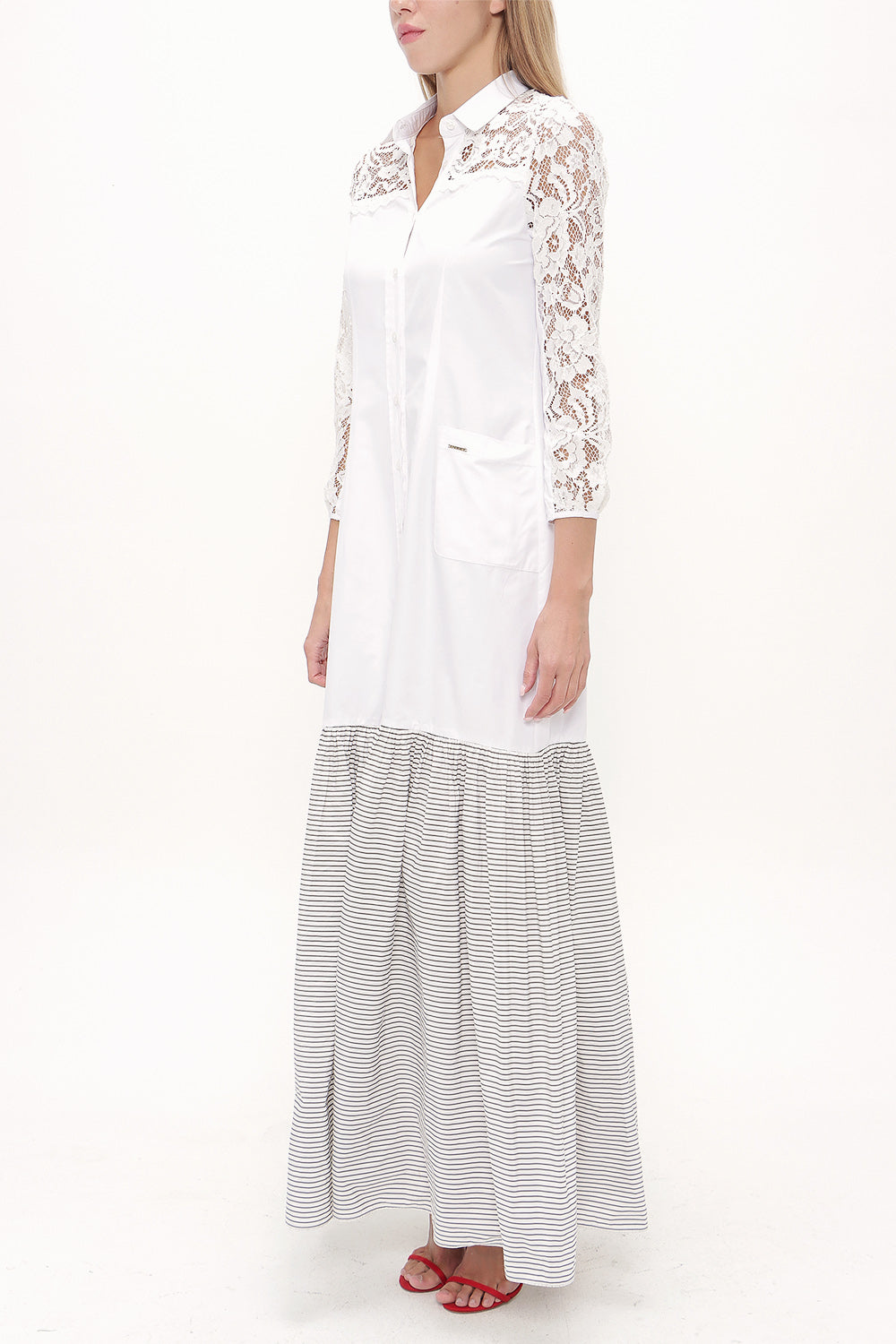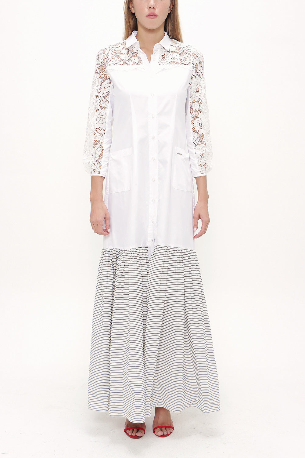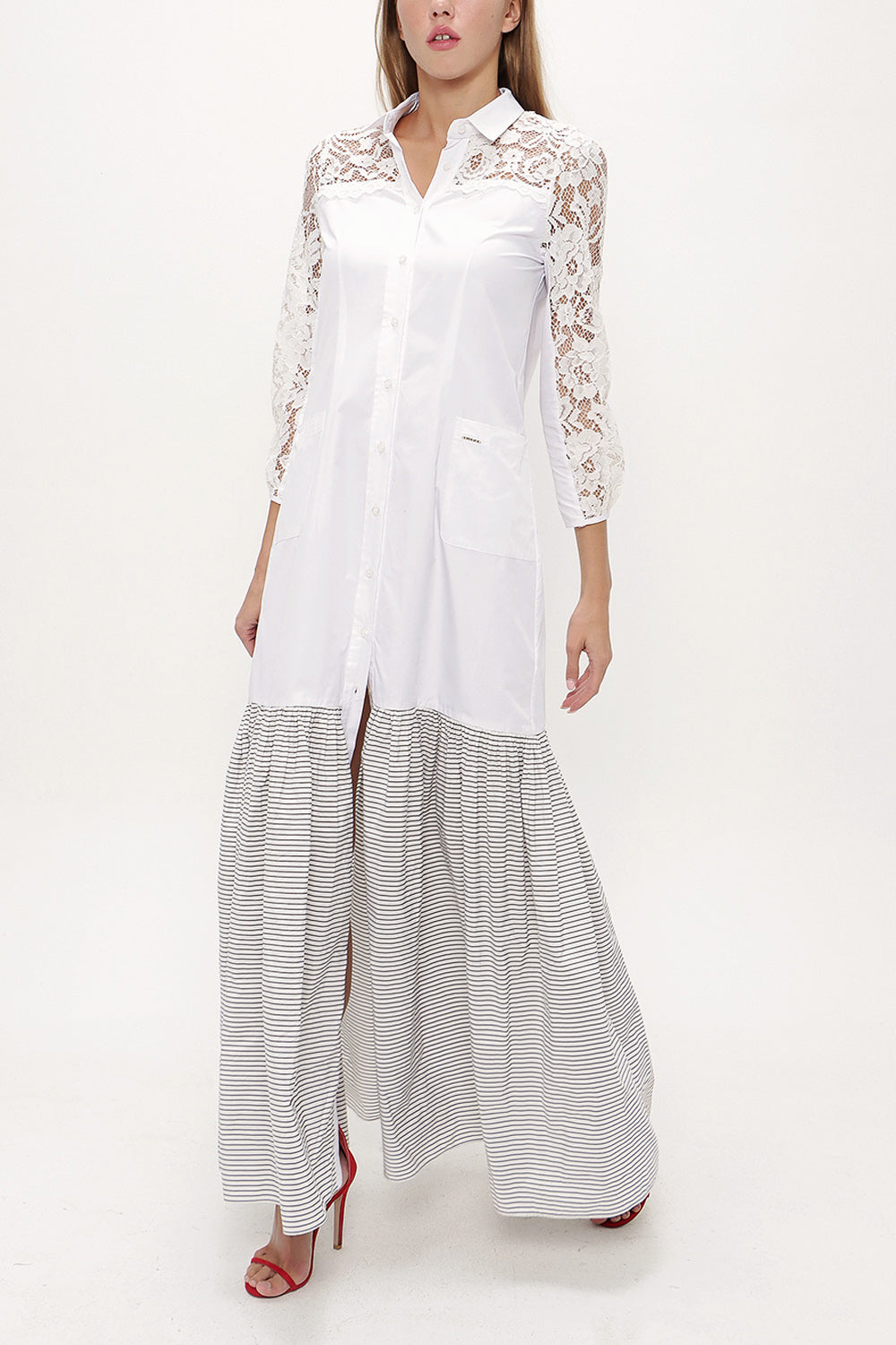 Beyaz Çizgili Dantelli uzun elbise 92248