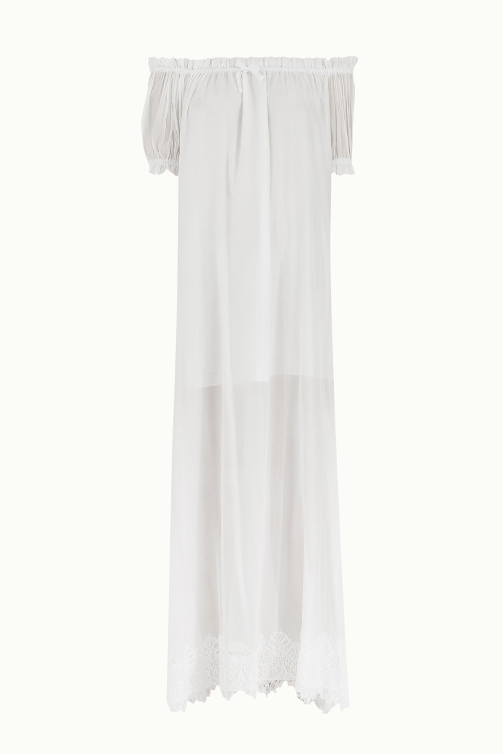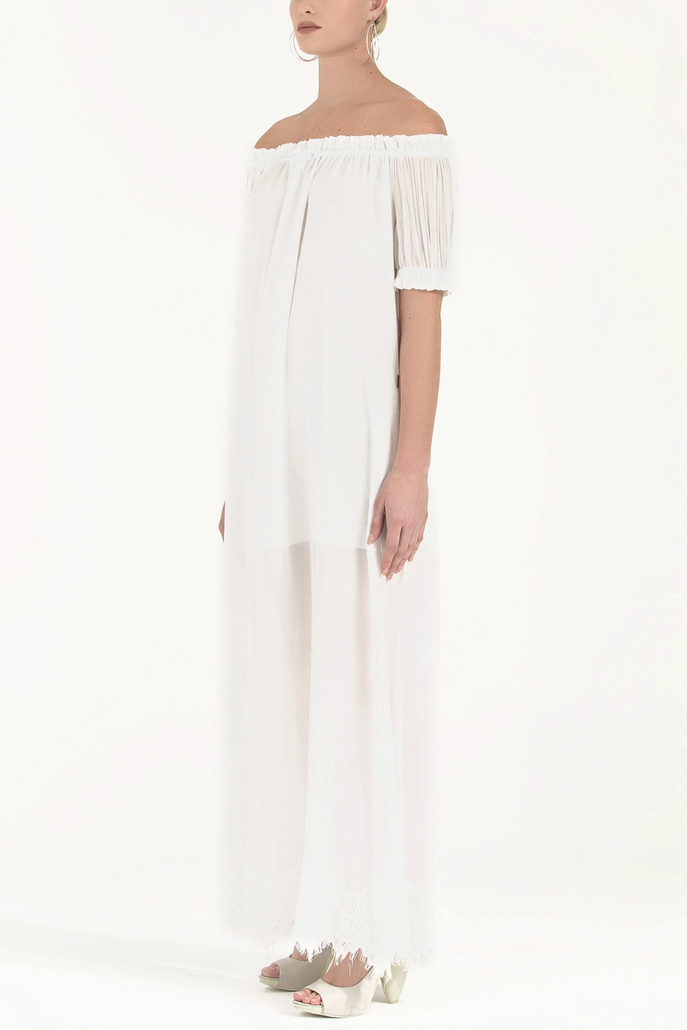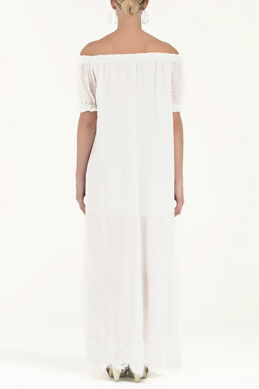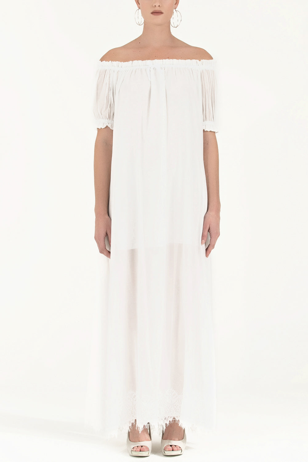 Beyaz Düşük omuzlu lastikli uzun elbise 92355