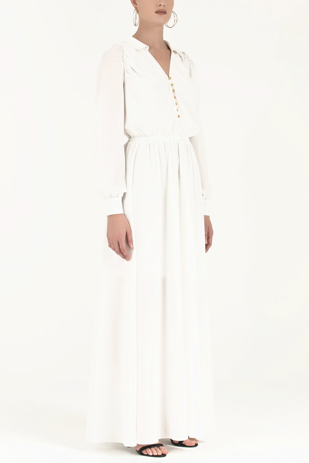 Beyaz Omuzları büzgülü düğmeli uzun elbise 92251
