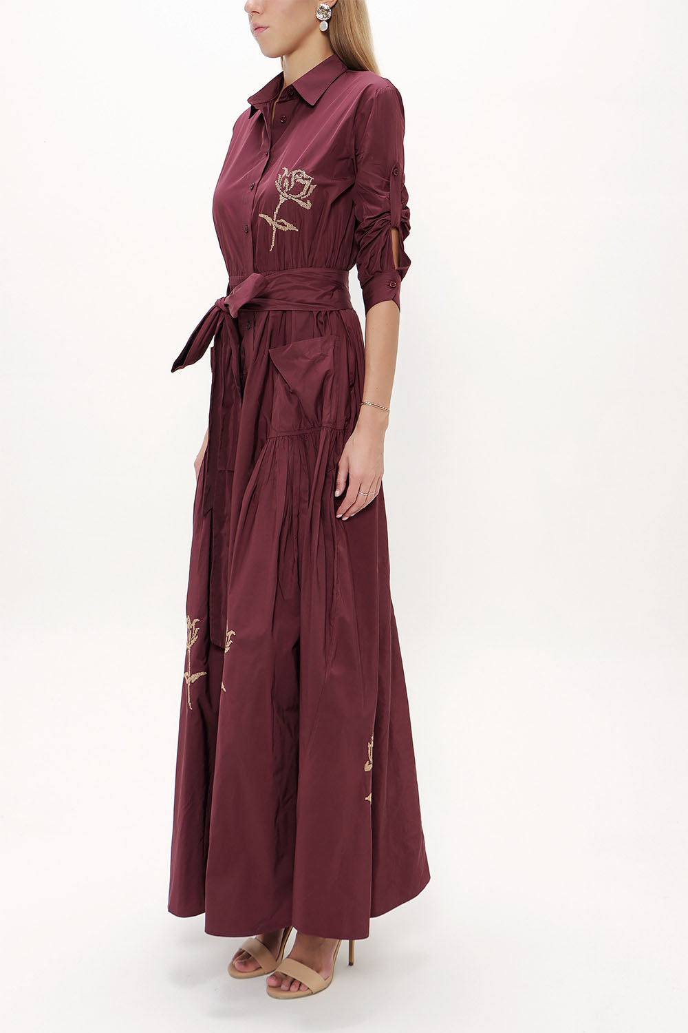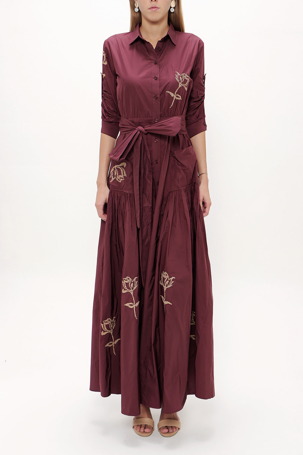 Bordo Nakışlı ve büzgülü uzun elbise 92605