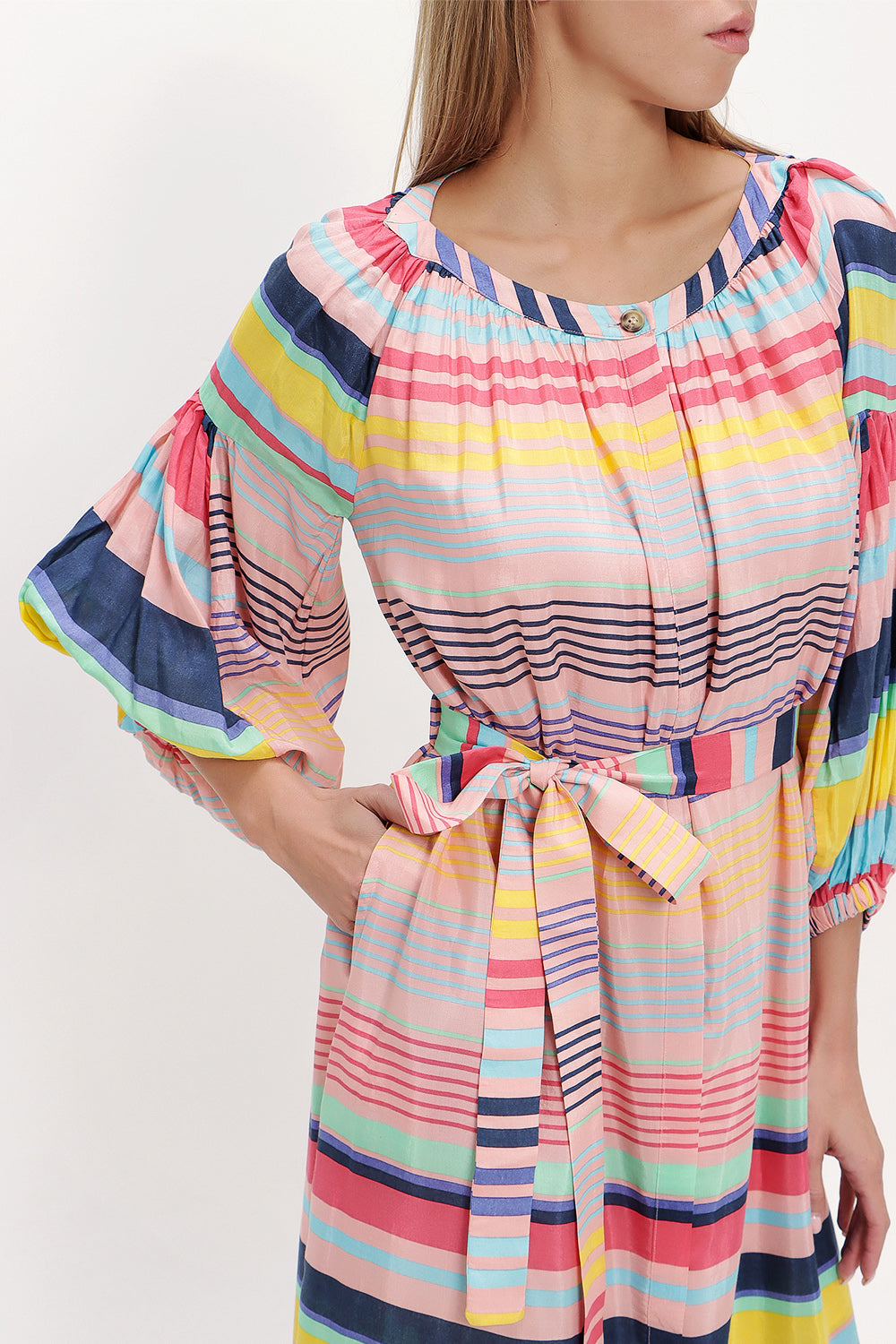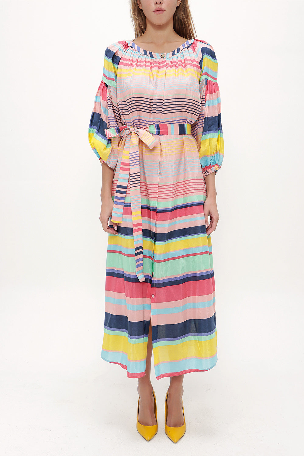 Çizgili Lastikli balon kol uzun elbise 92718