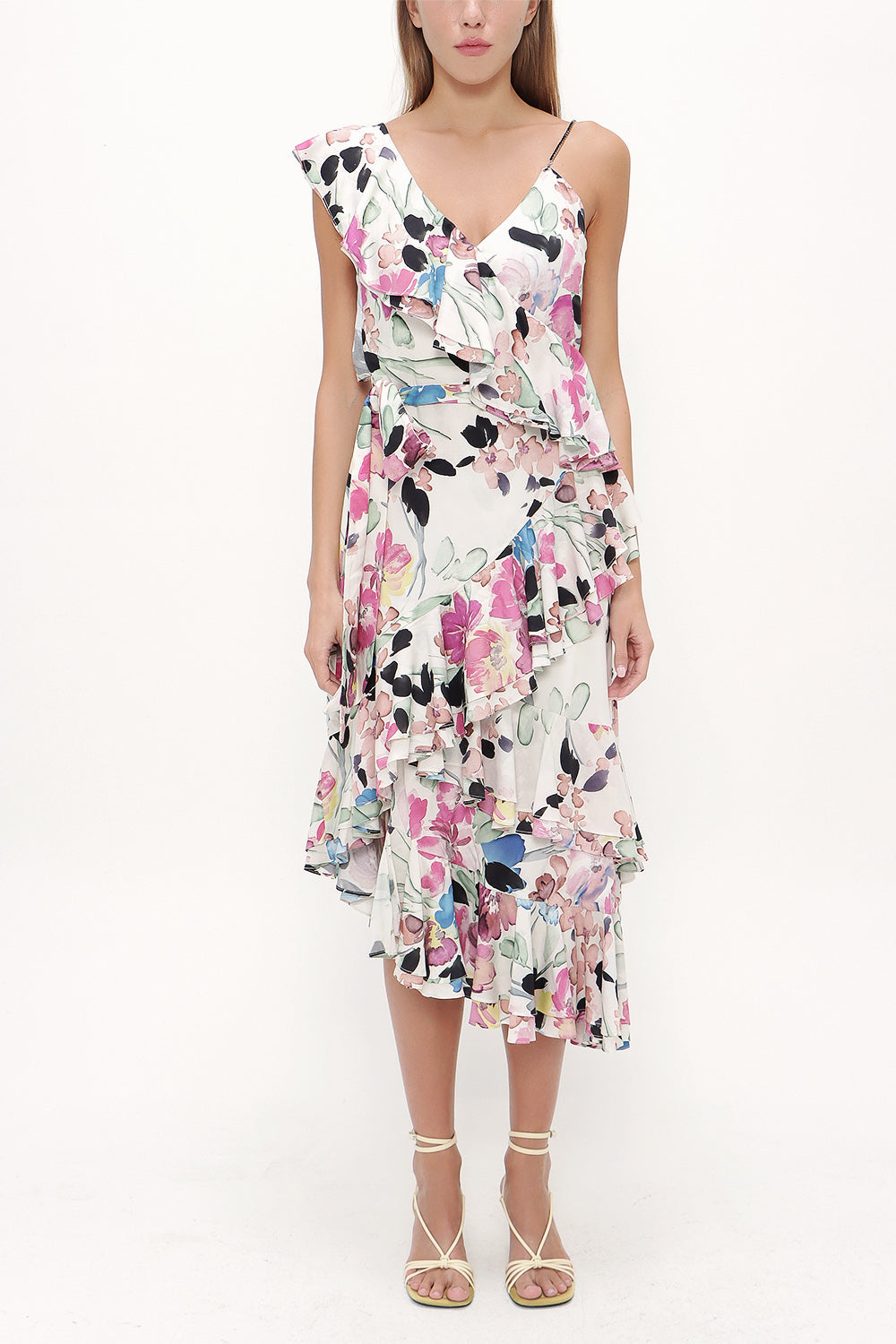Desenli Fırfır detaylı desenli midi elbise 92774