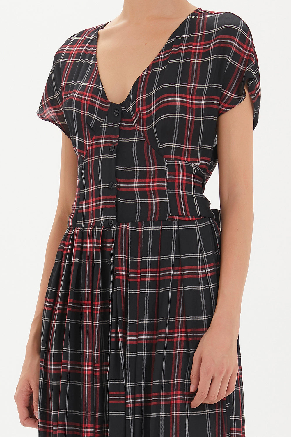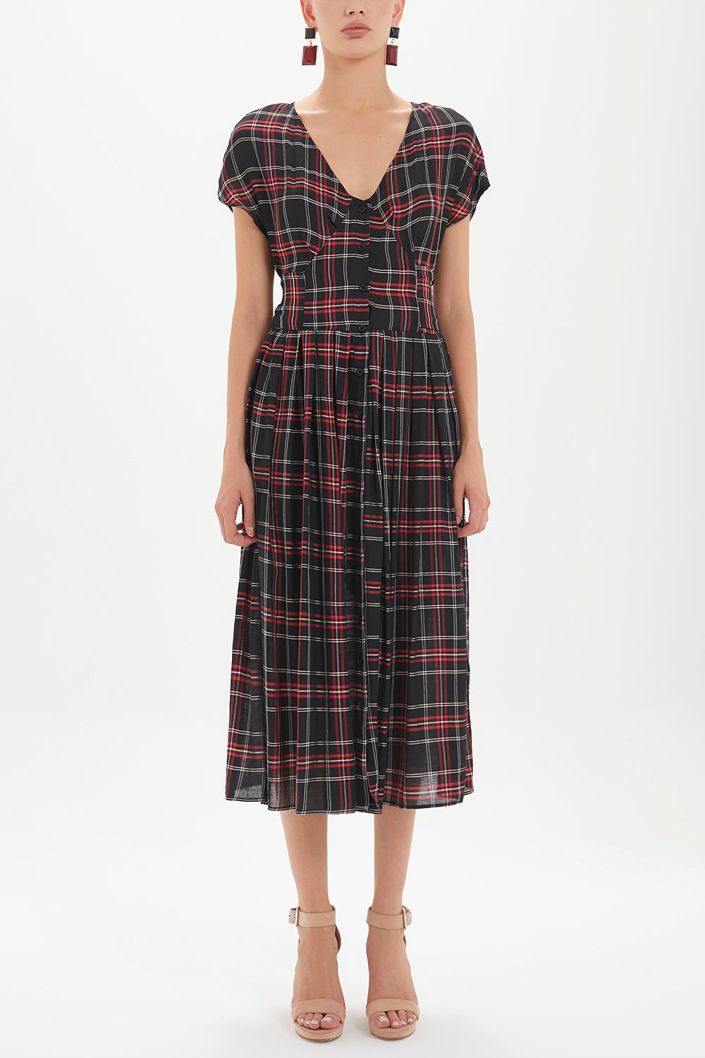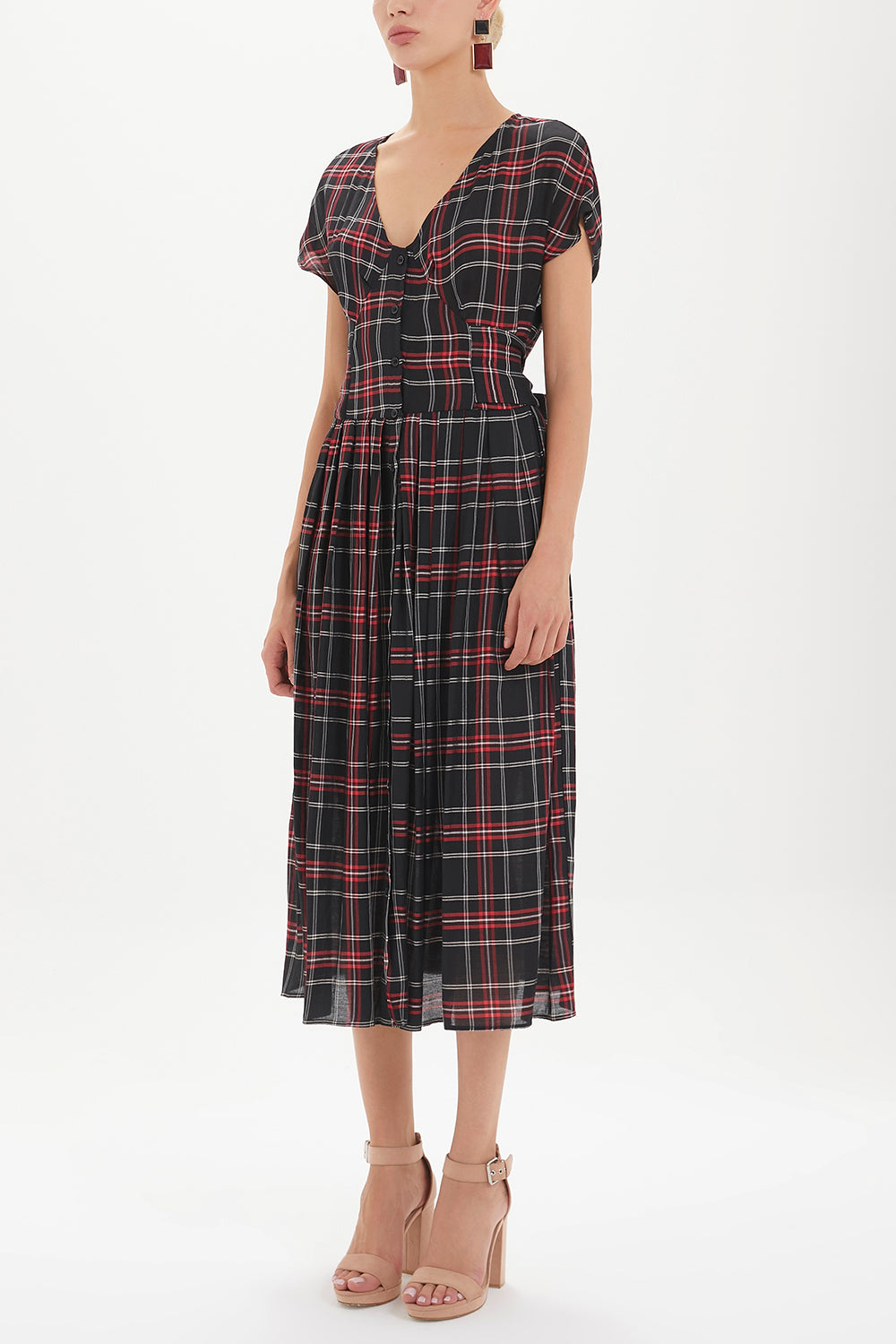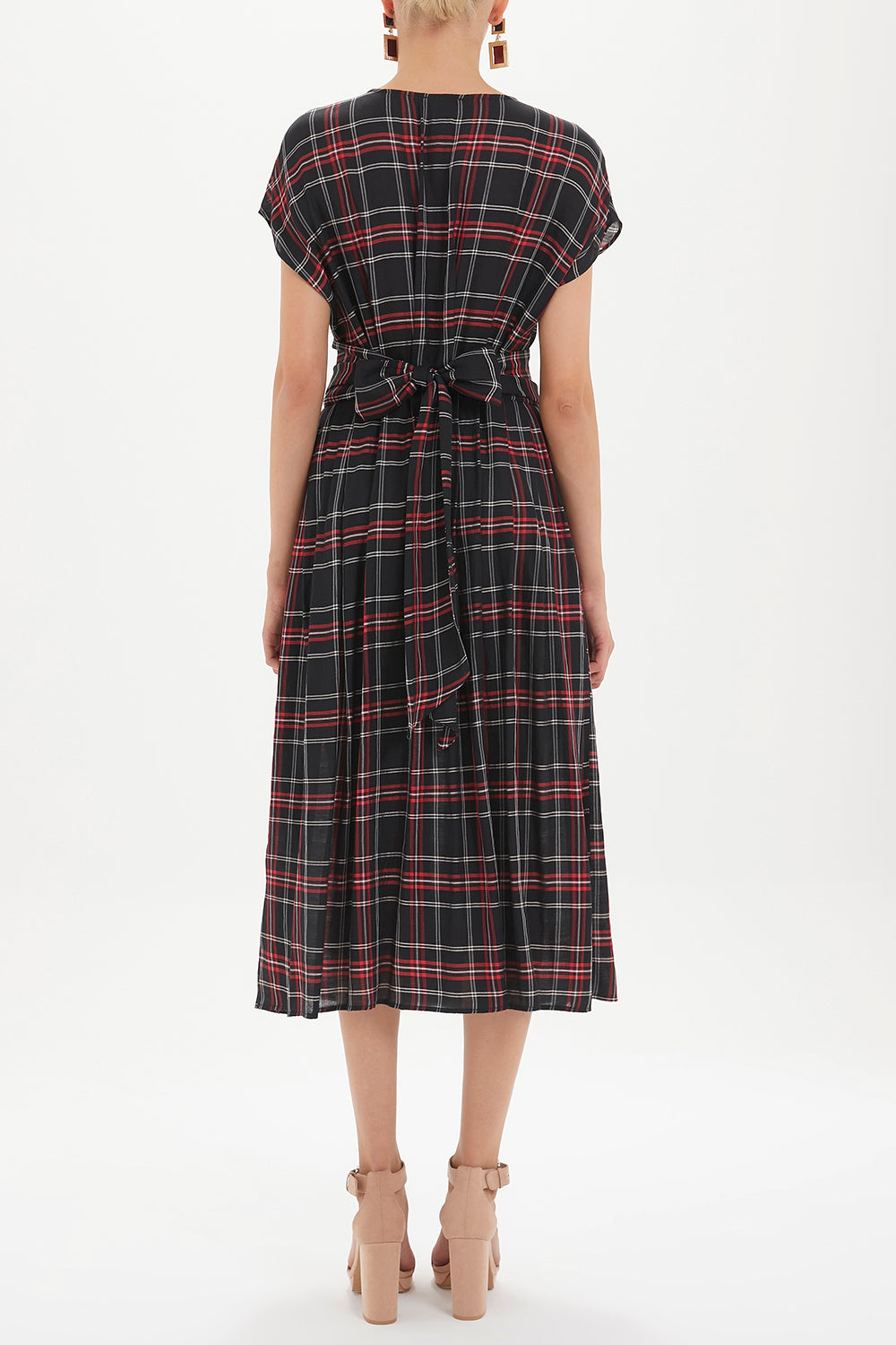 Desenli V yaka belden bağcıklı elbise midi 92409
