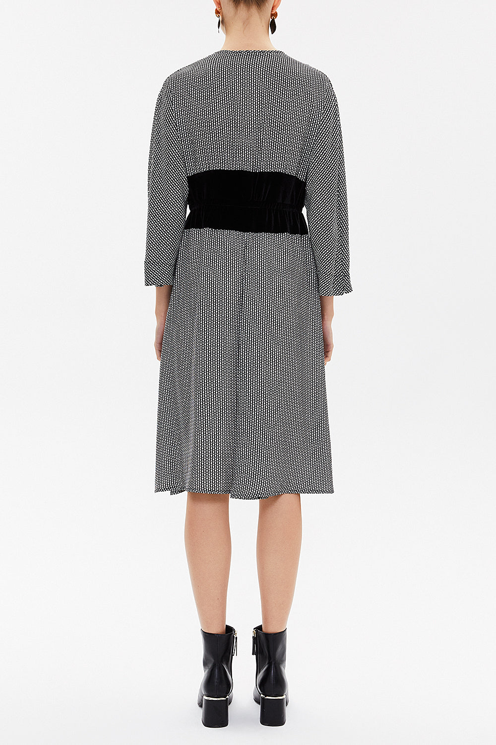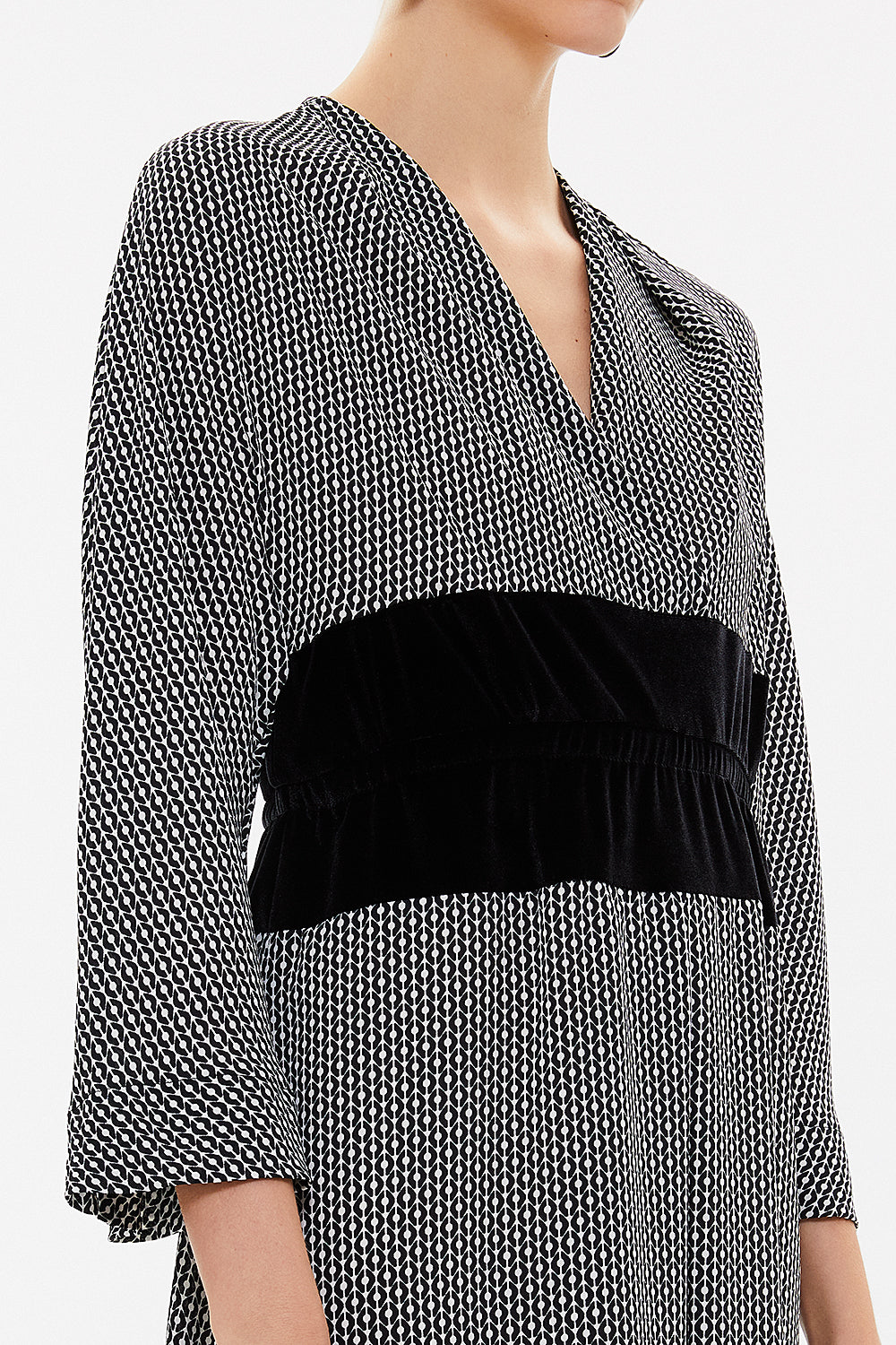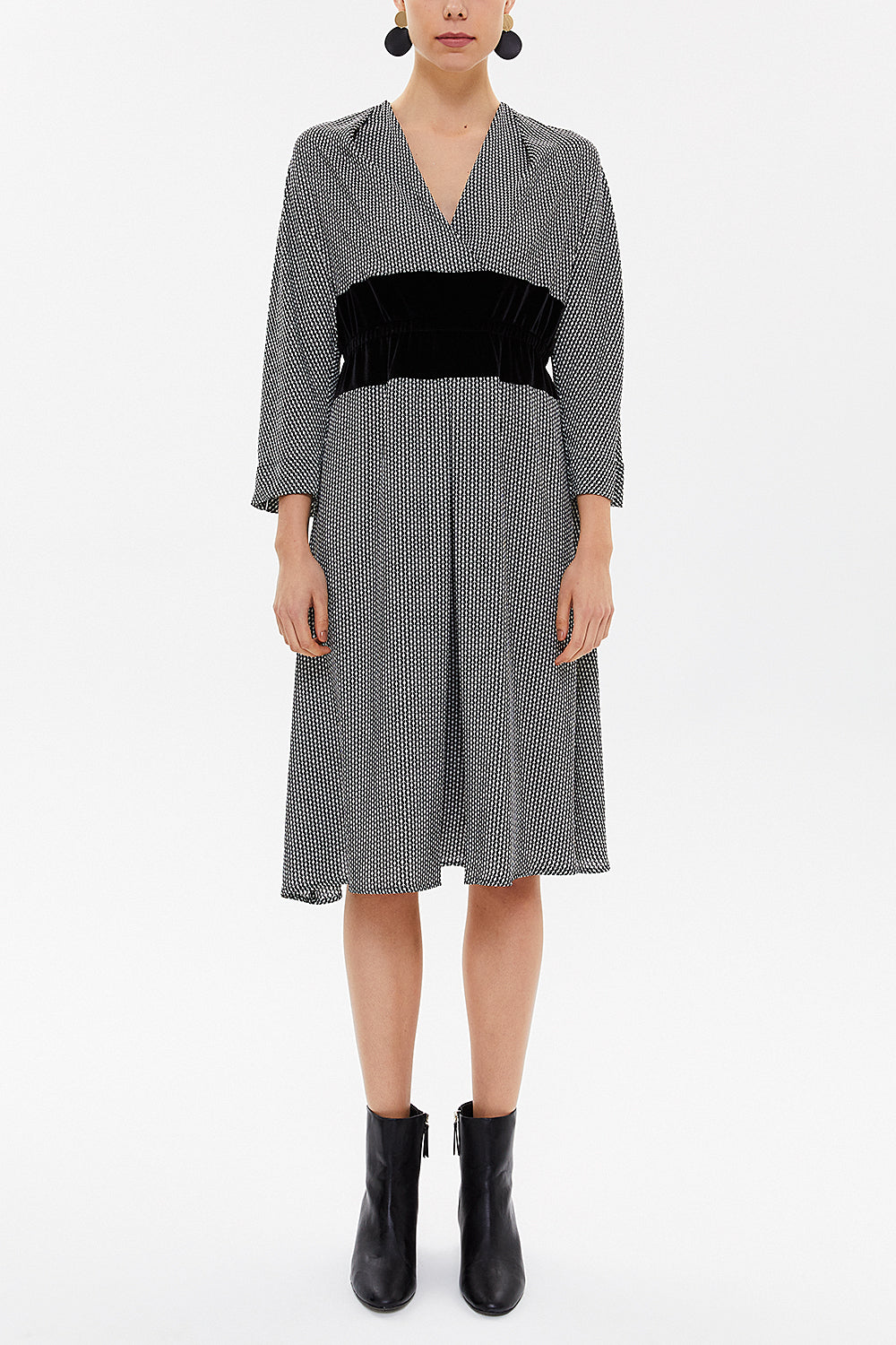 Desenli V yaka kadife kumaş kombinli midi elbise 92485