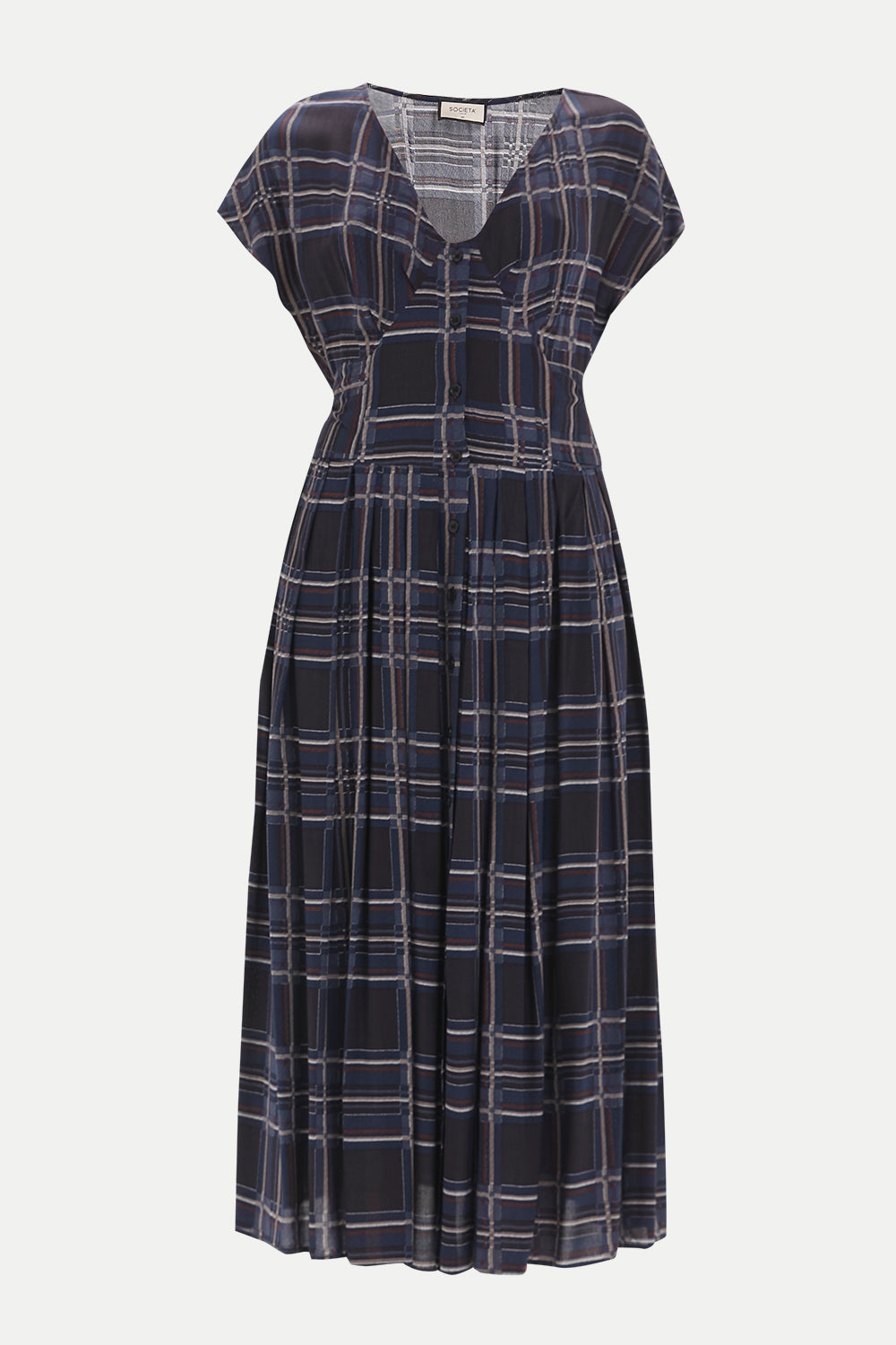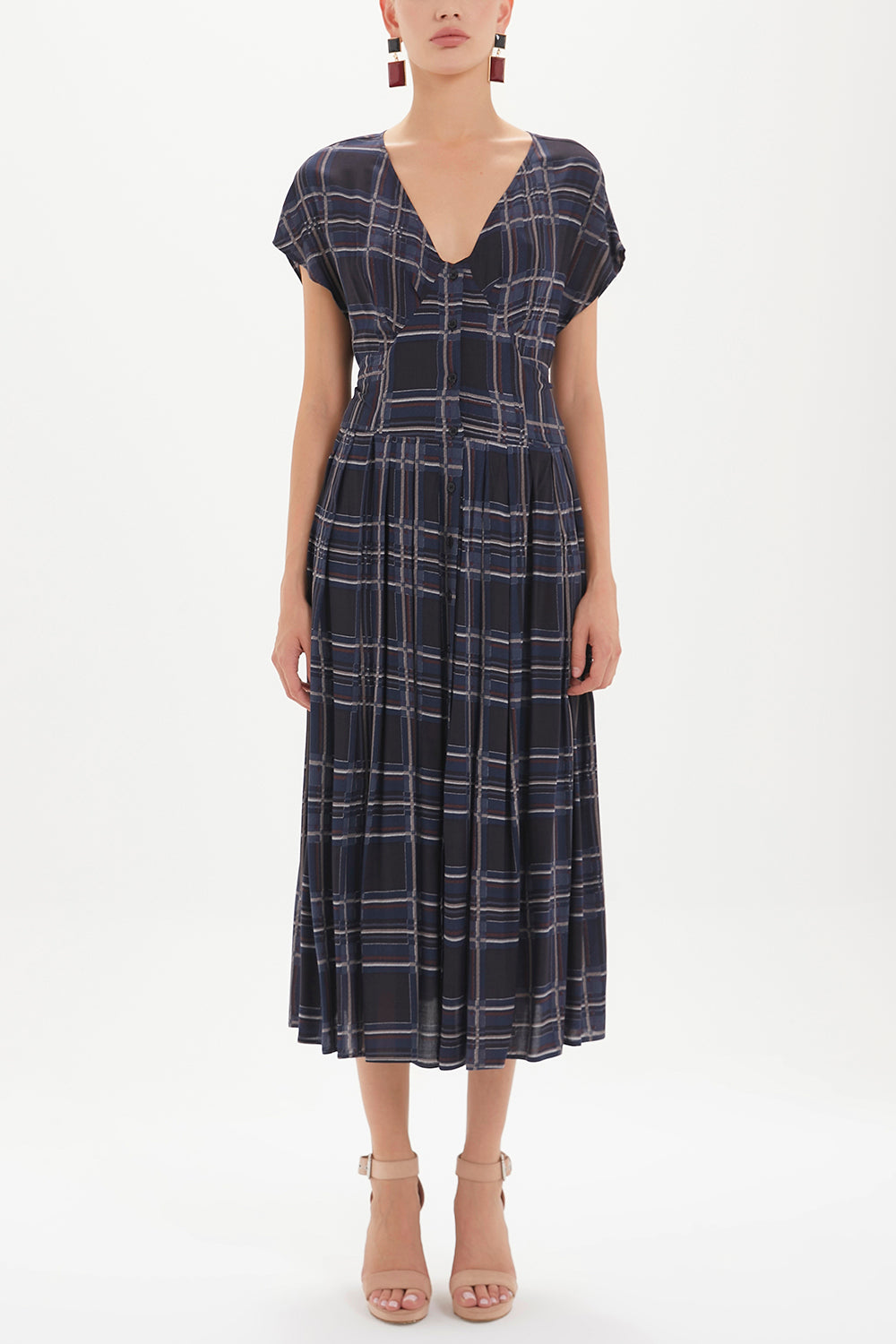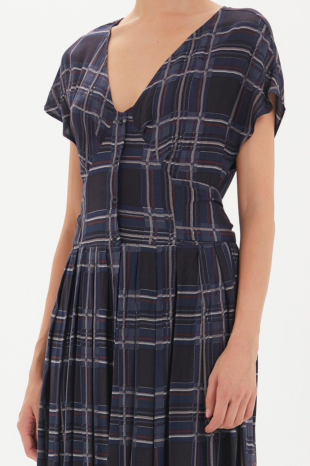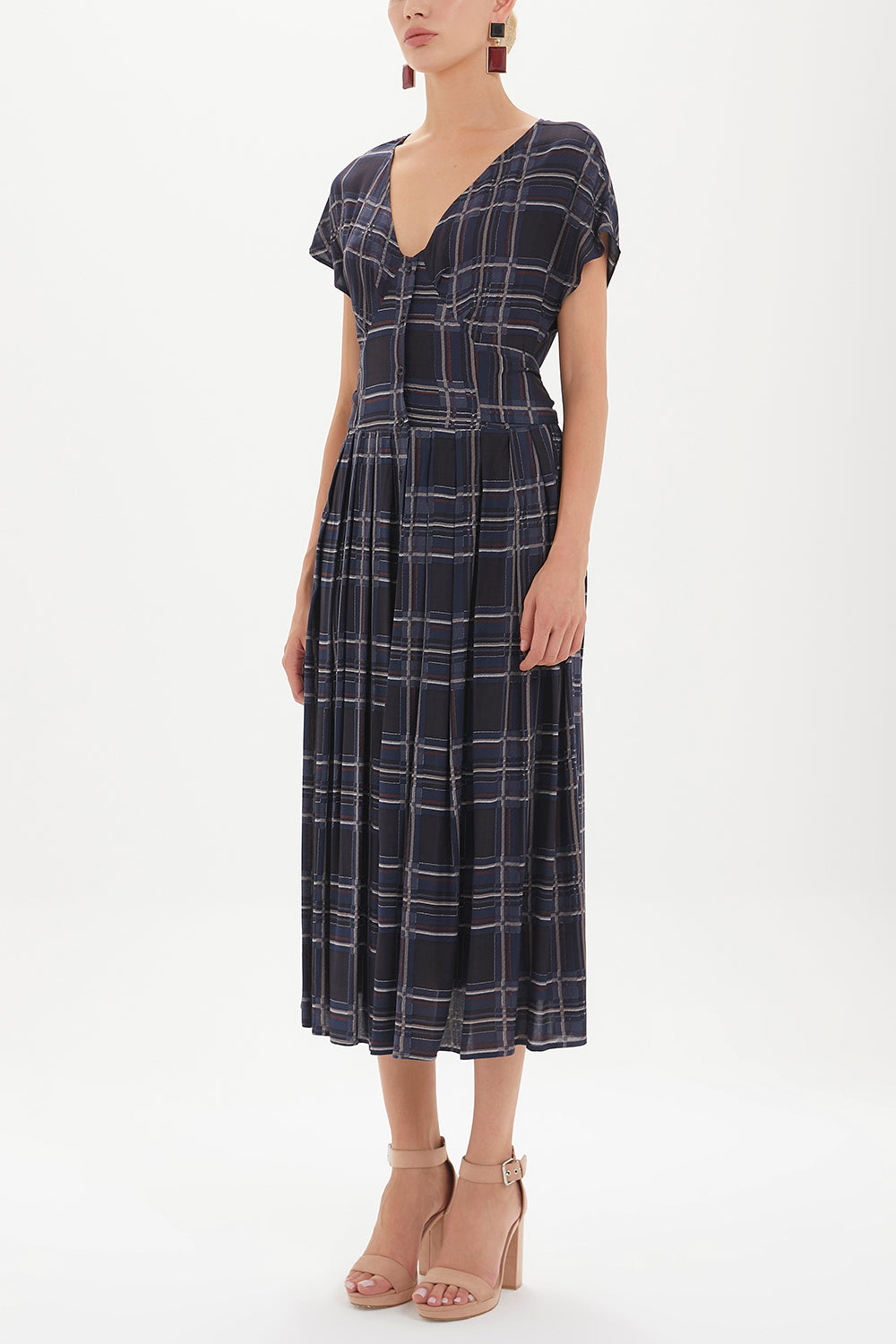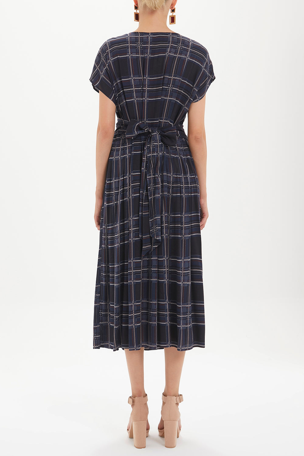 Ekose V yaka belden bağcıklı elbise midi 92409