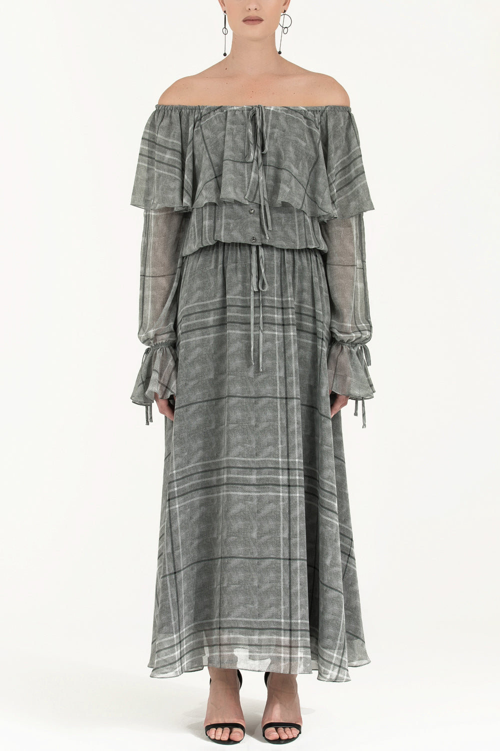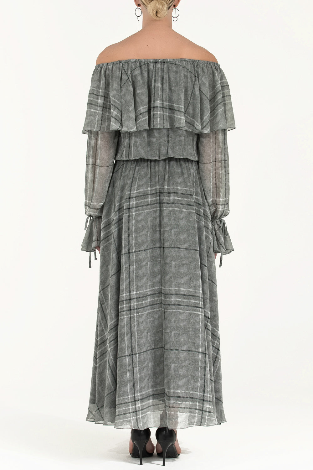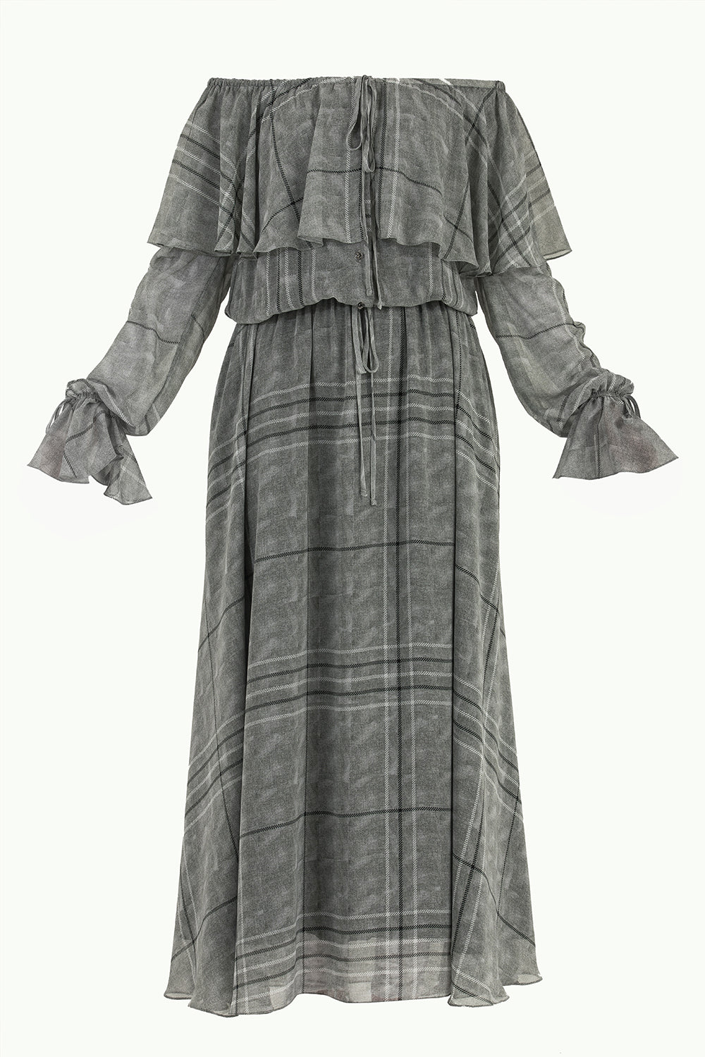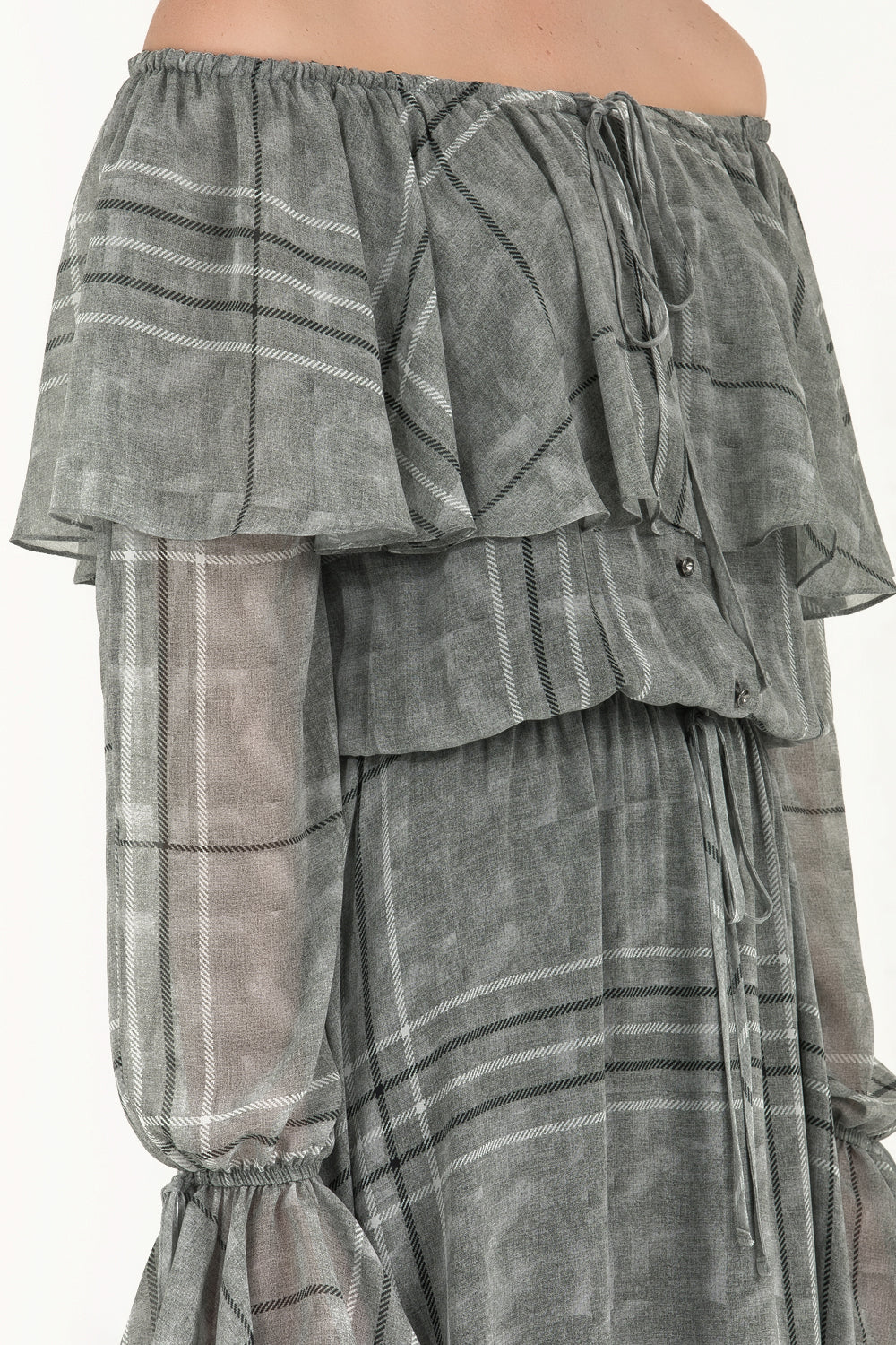 Füme Volanlı düşük omuz şifon uzun elbise 92303