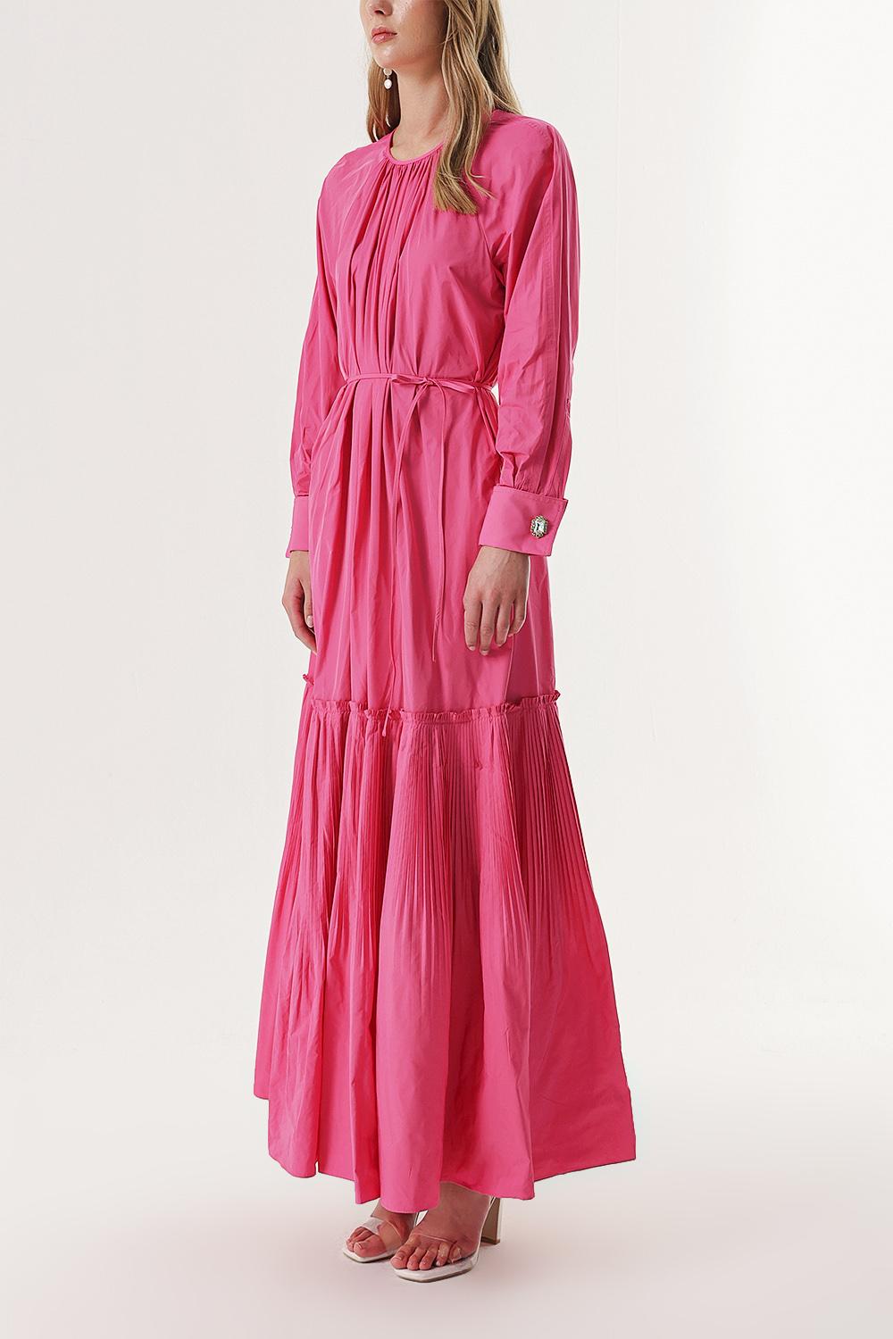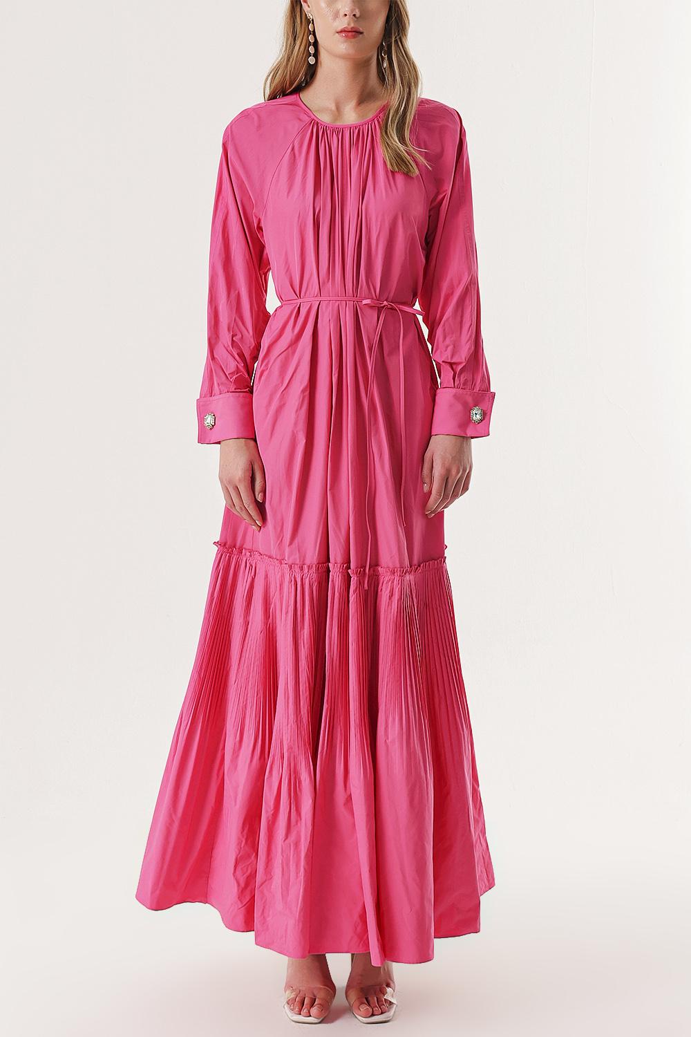 Fuşya Pilise detaylı kol düğmeli bol kesim elbise 94197