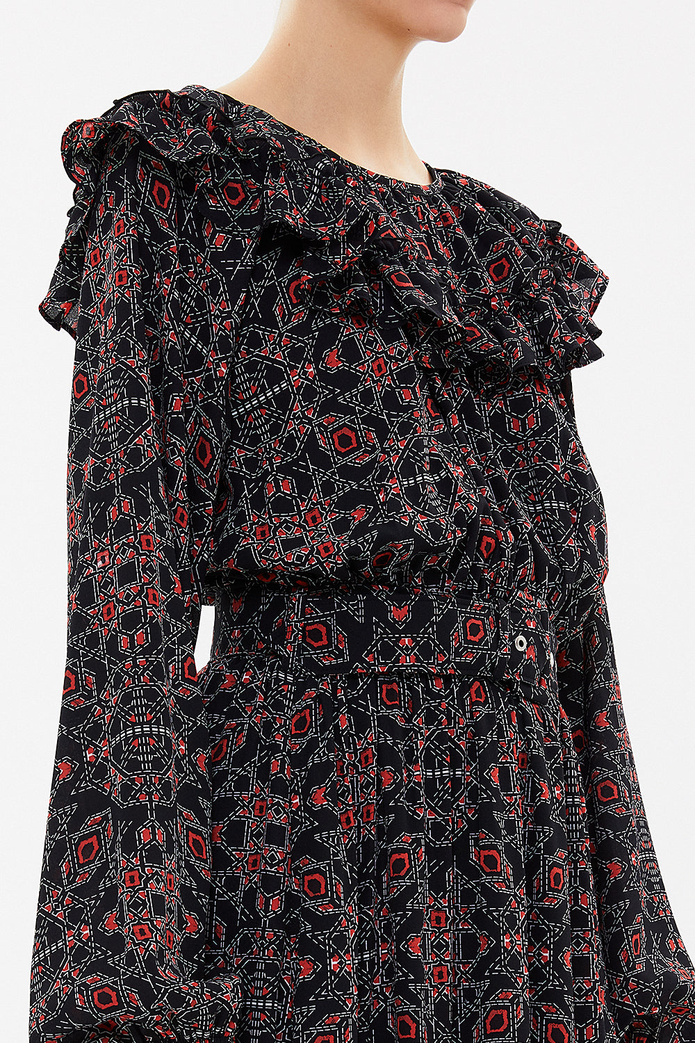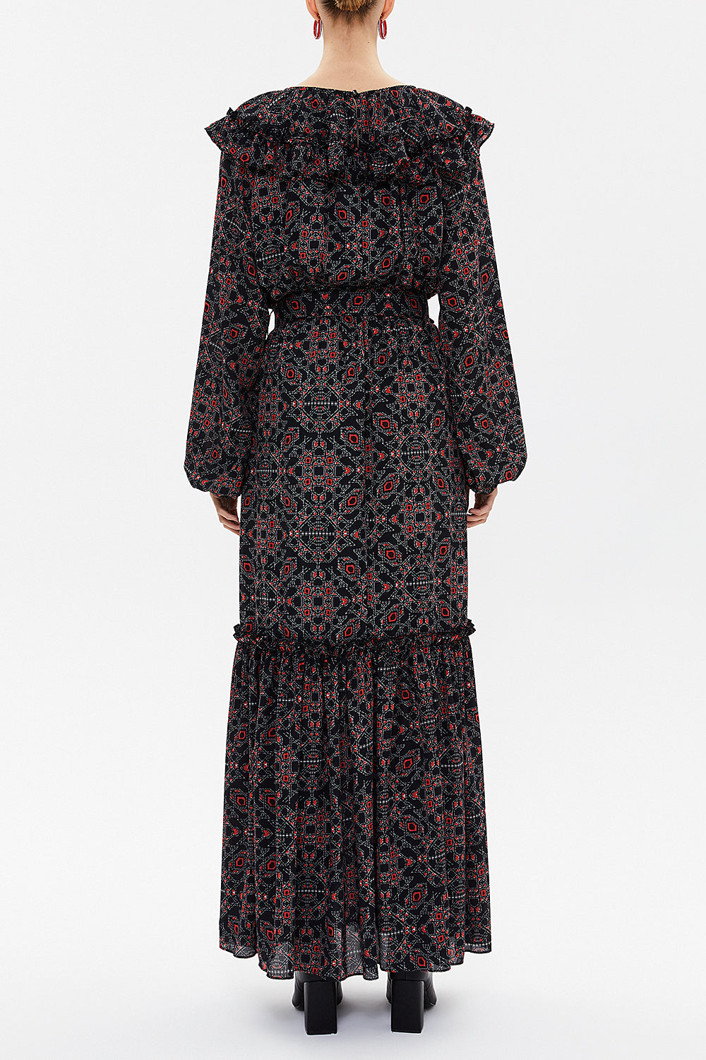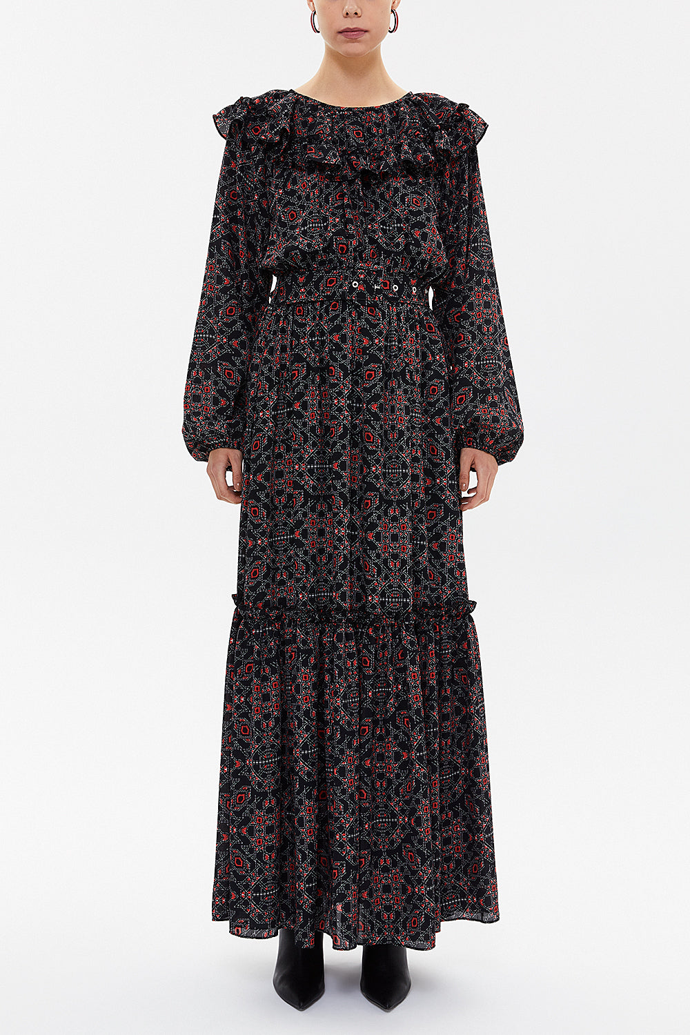 Kırçıllı Siyah Yakası volanlı uzun büzgülü elbise 93292