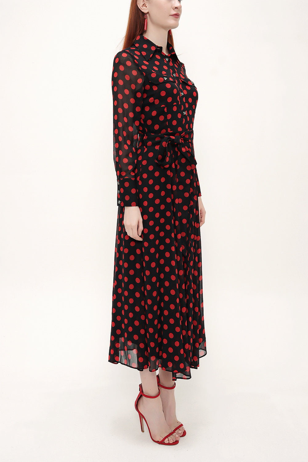 Kırmızı Düğmeli ve kemerli uzun elbise 92758