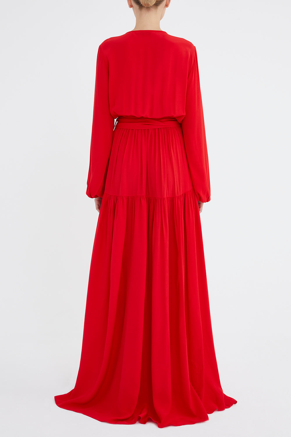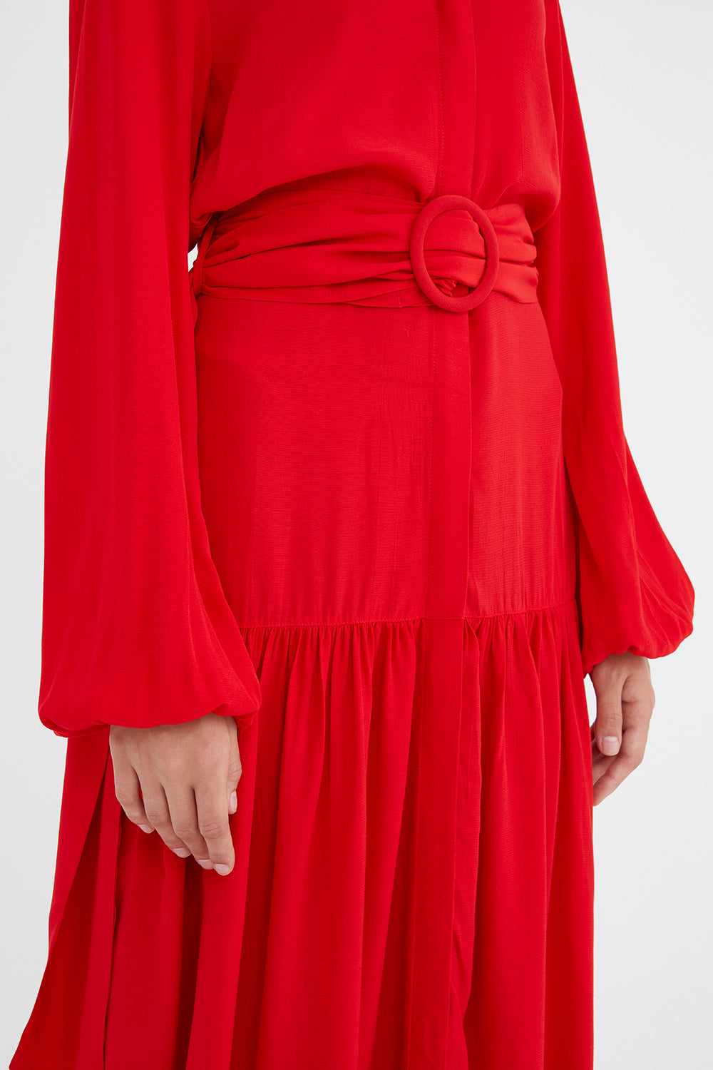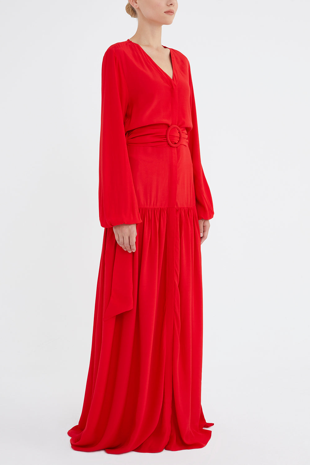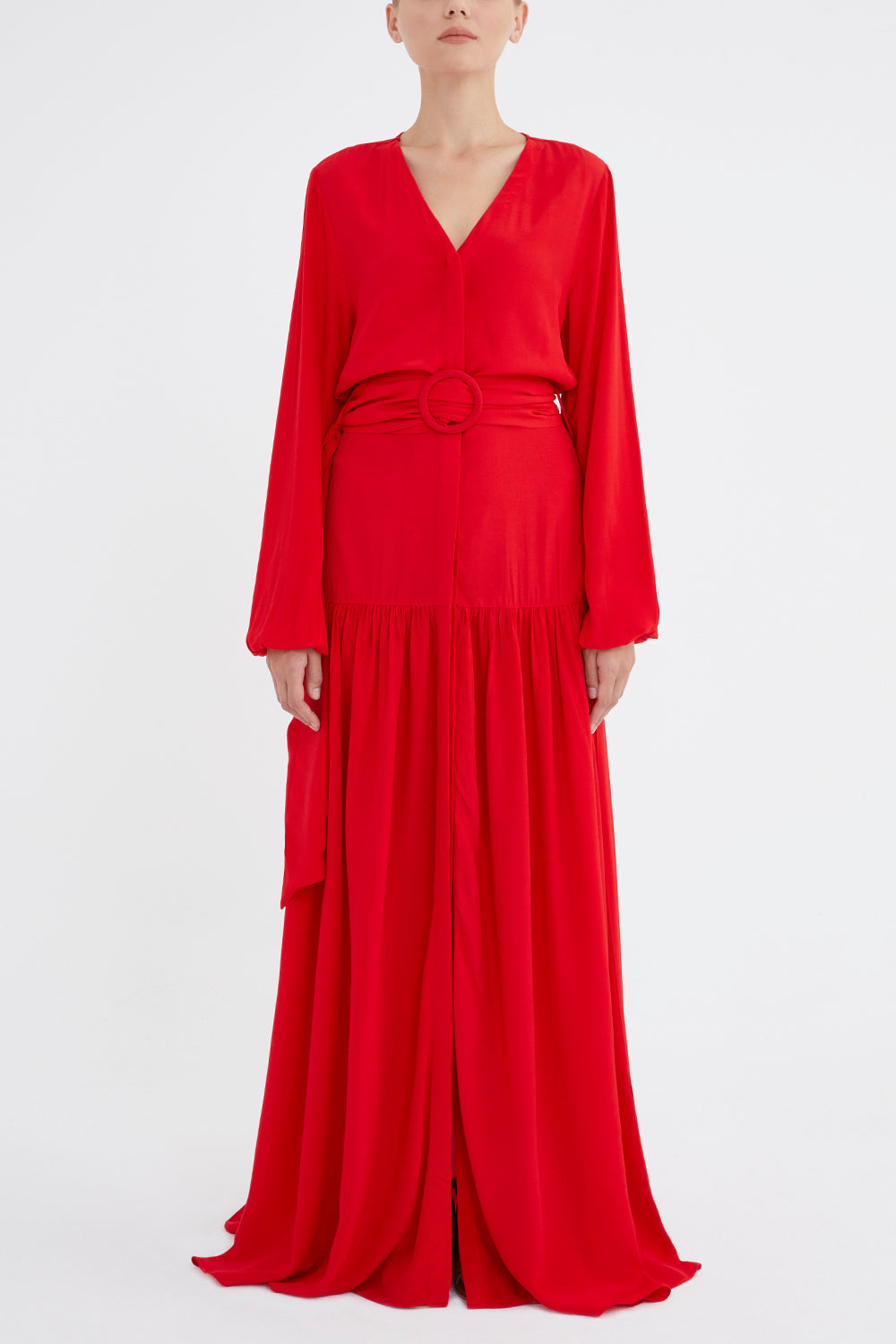 Kırmızı V yaka uzun kemerli uzun elbise 92886