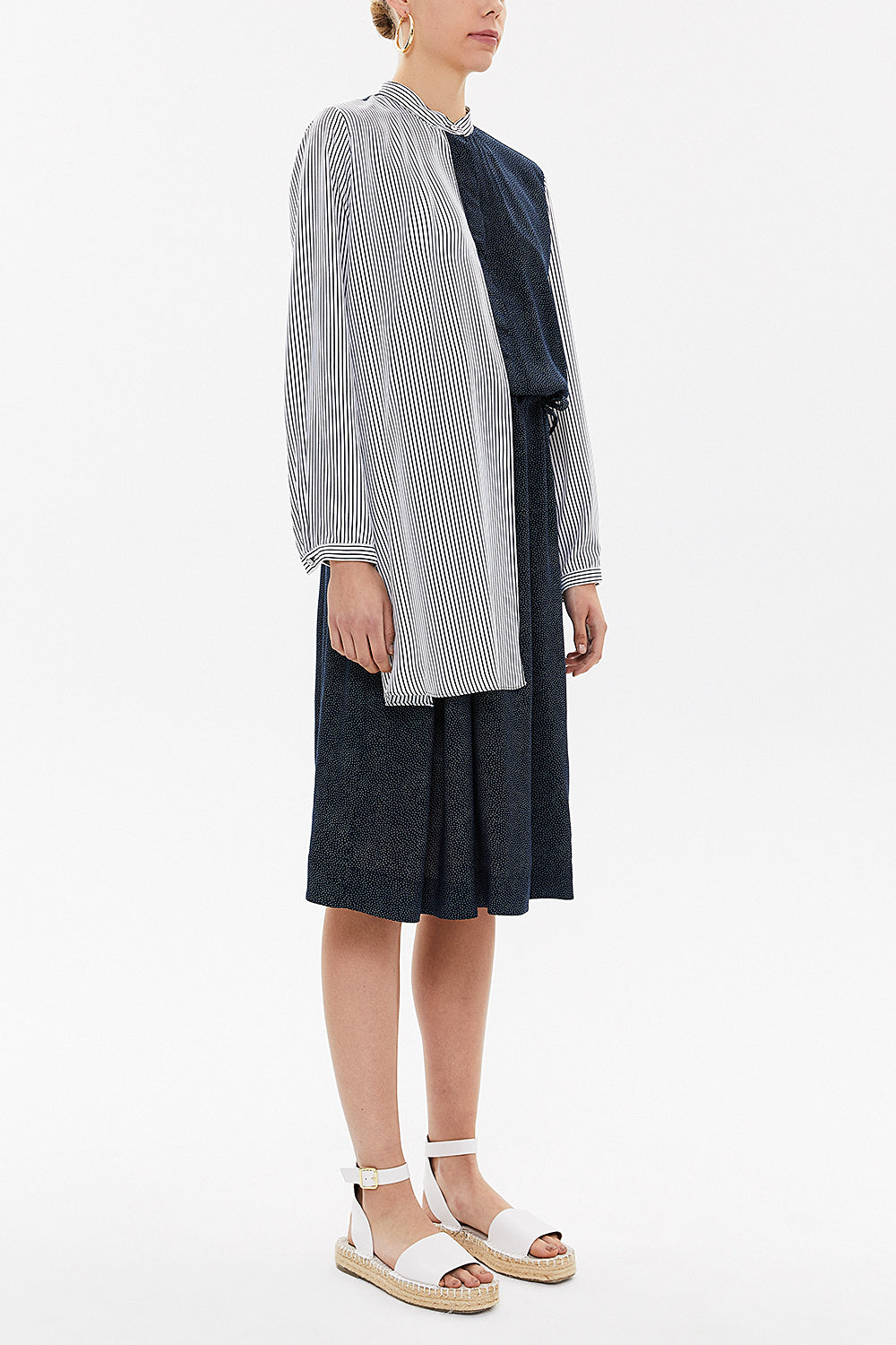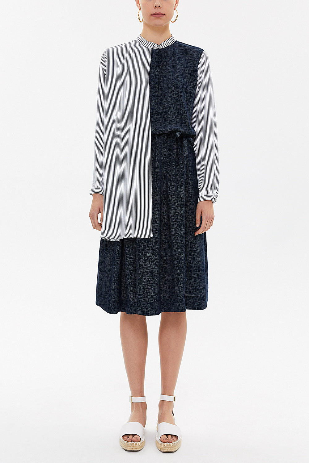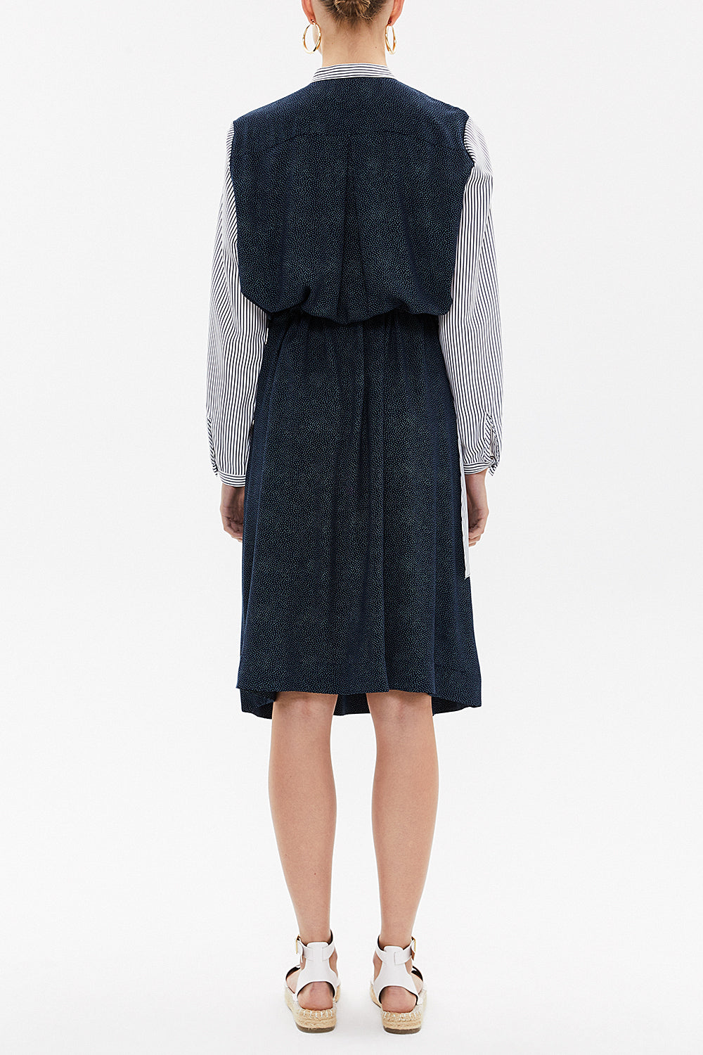 Lacivert Çizgili kumaş kombinli düğmeli midi elbise 92805