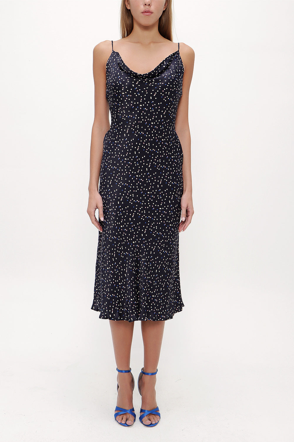 Lacivert Degaje yaka ip askılı midi elbise 92844