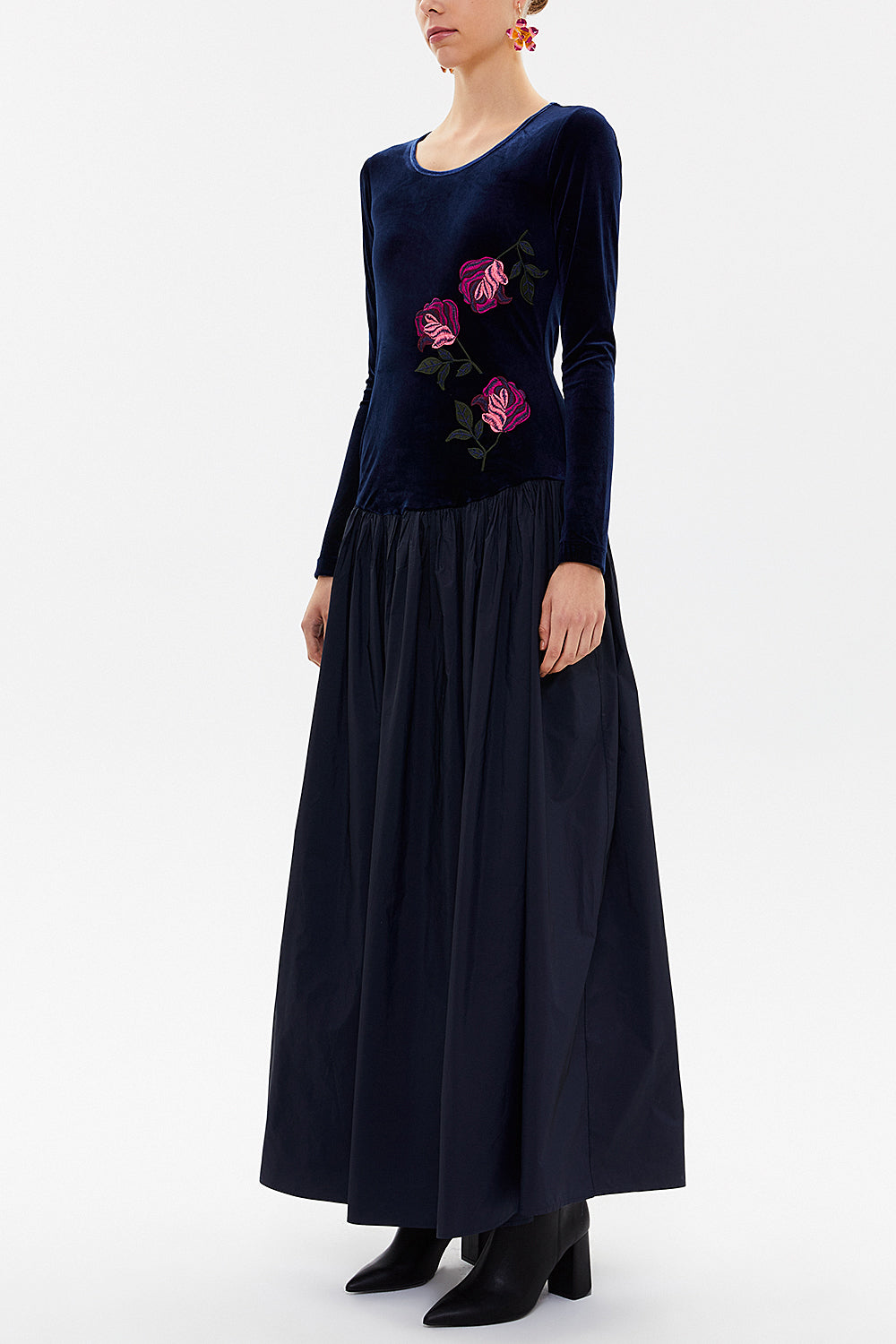 Lacivert Nakışlı kadife detaylı uzun elbise 92148
