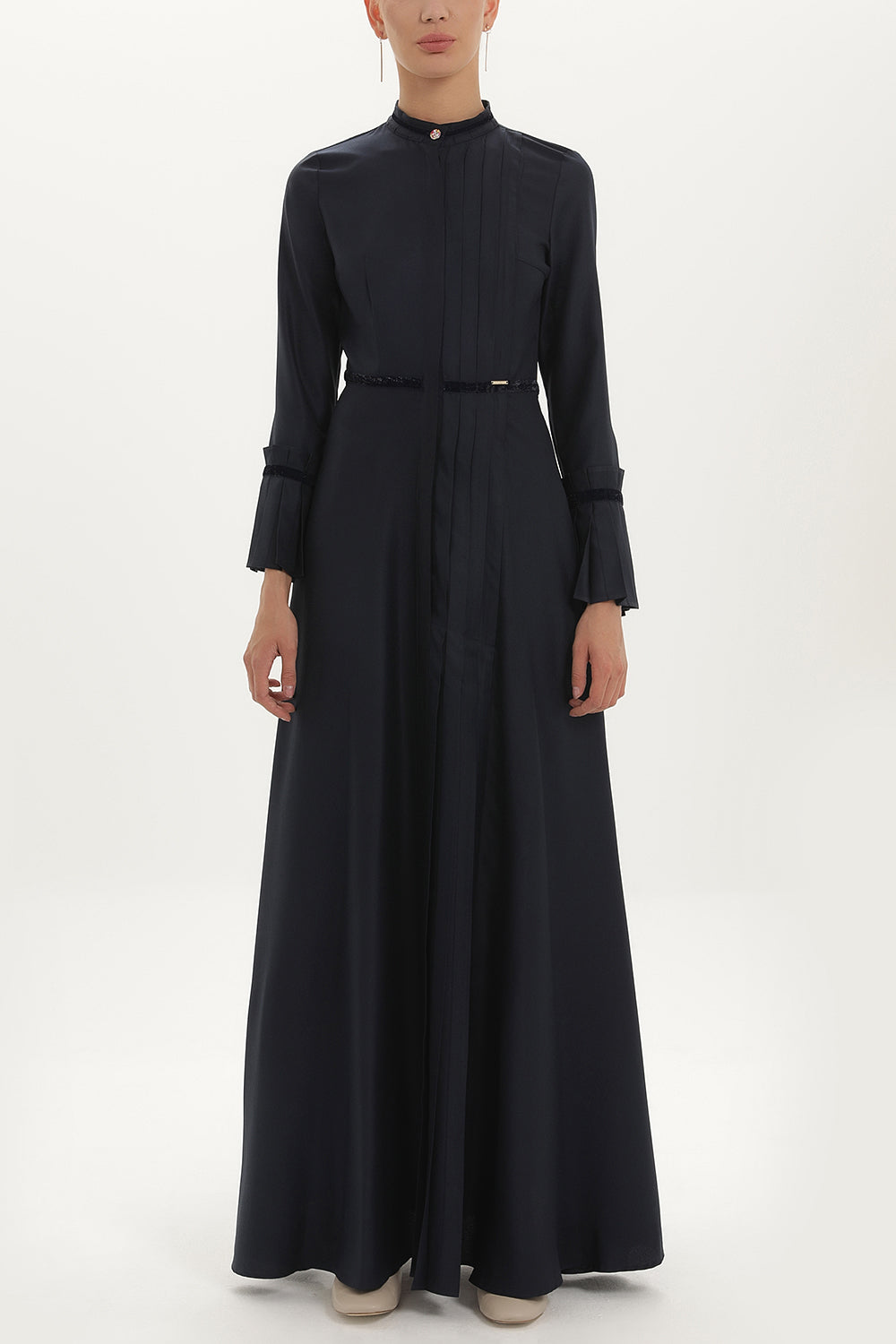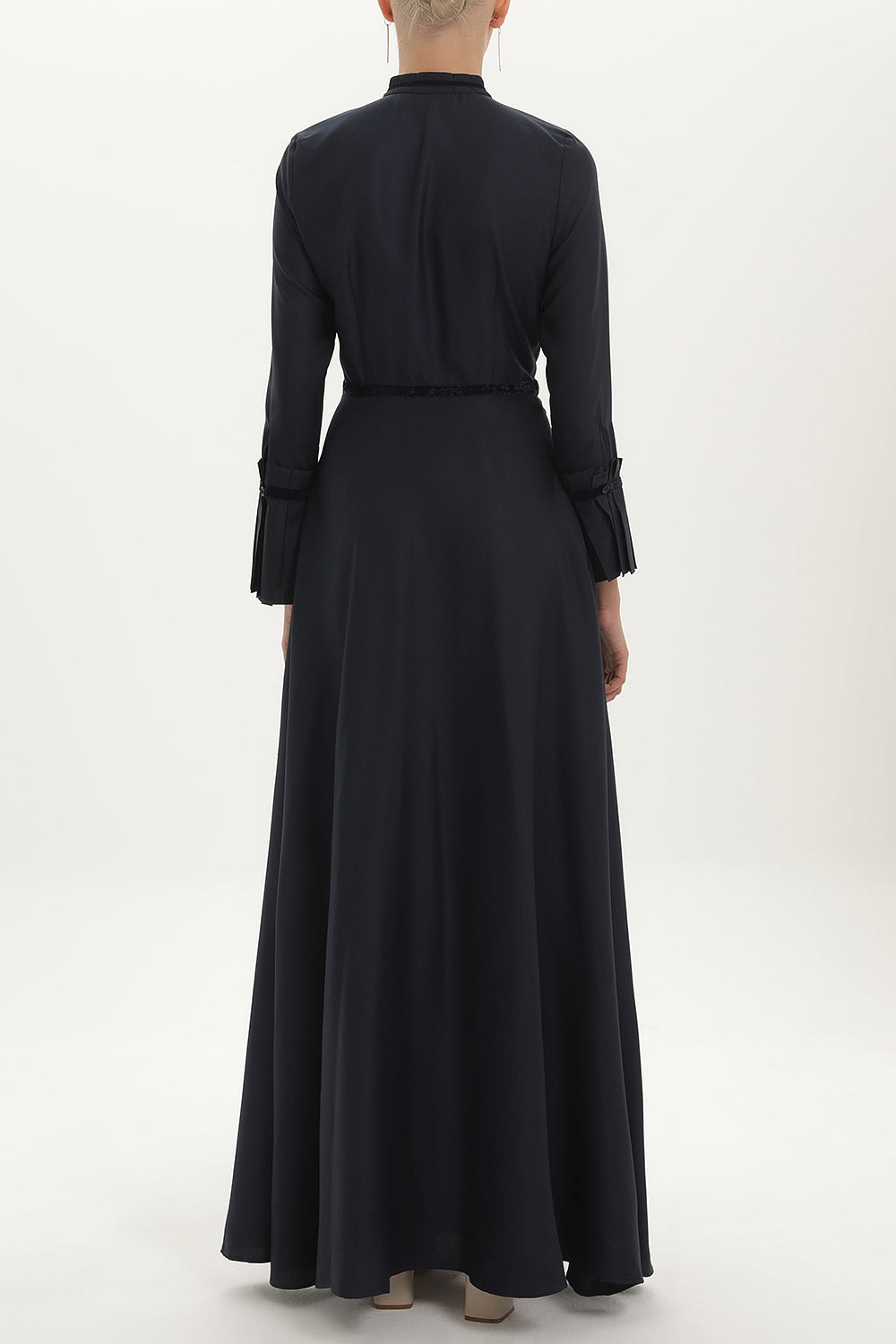 Lacivert Pilise detaylı belden oturtmalı uzun elbise 92196