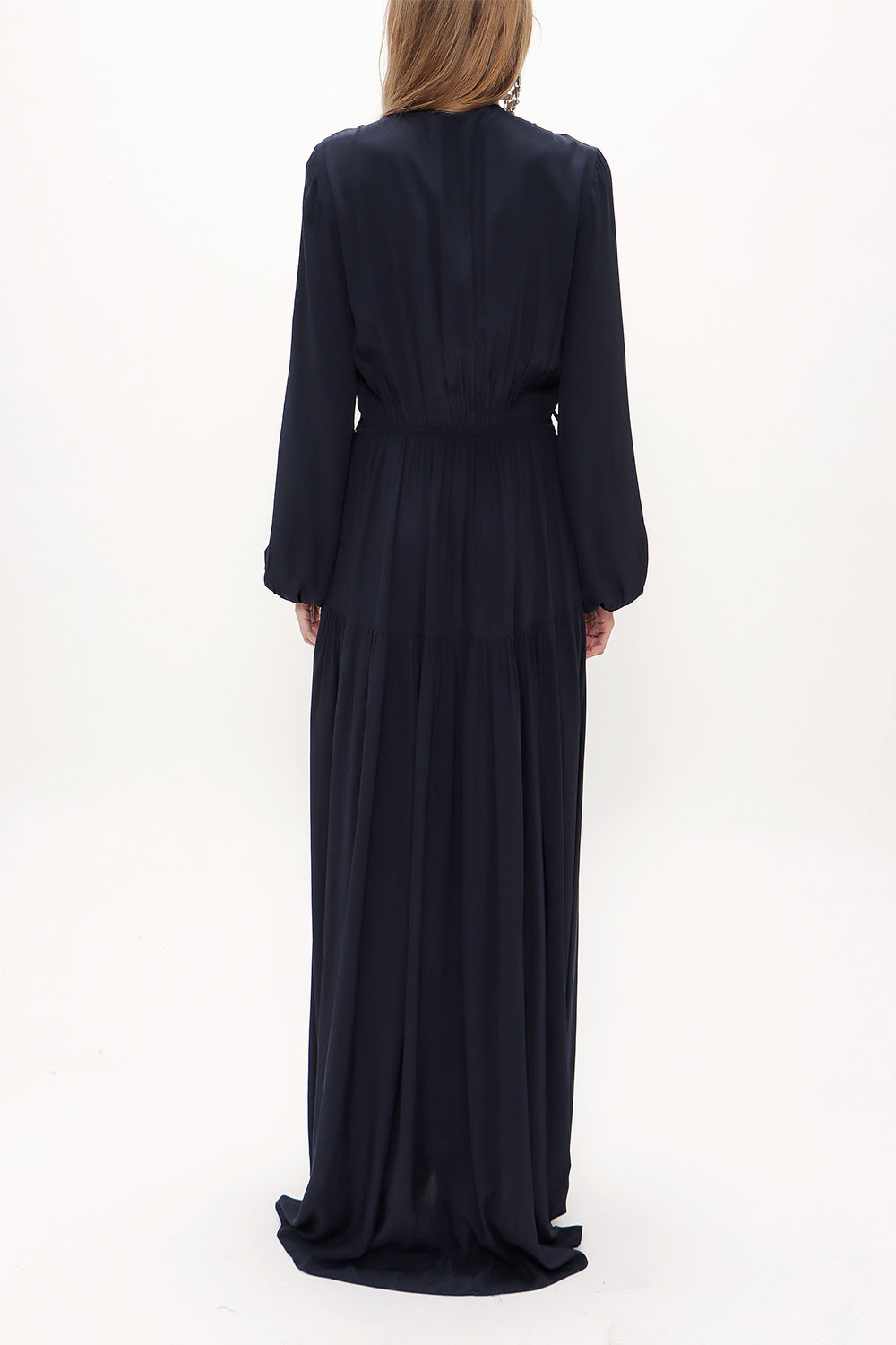 Lacivert V yaka uzun kemerli uzun elbise 92886