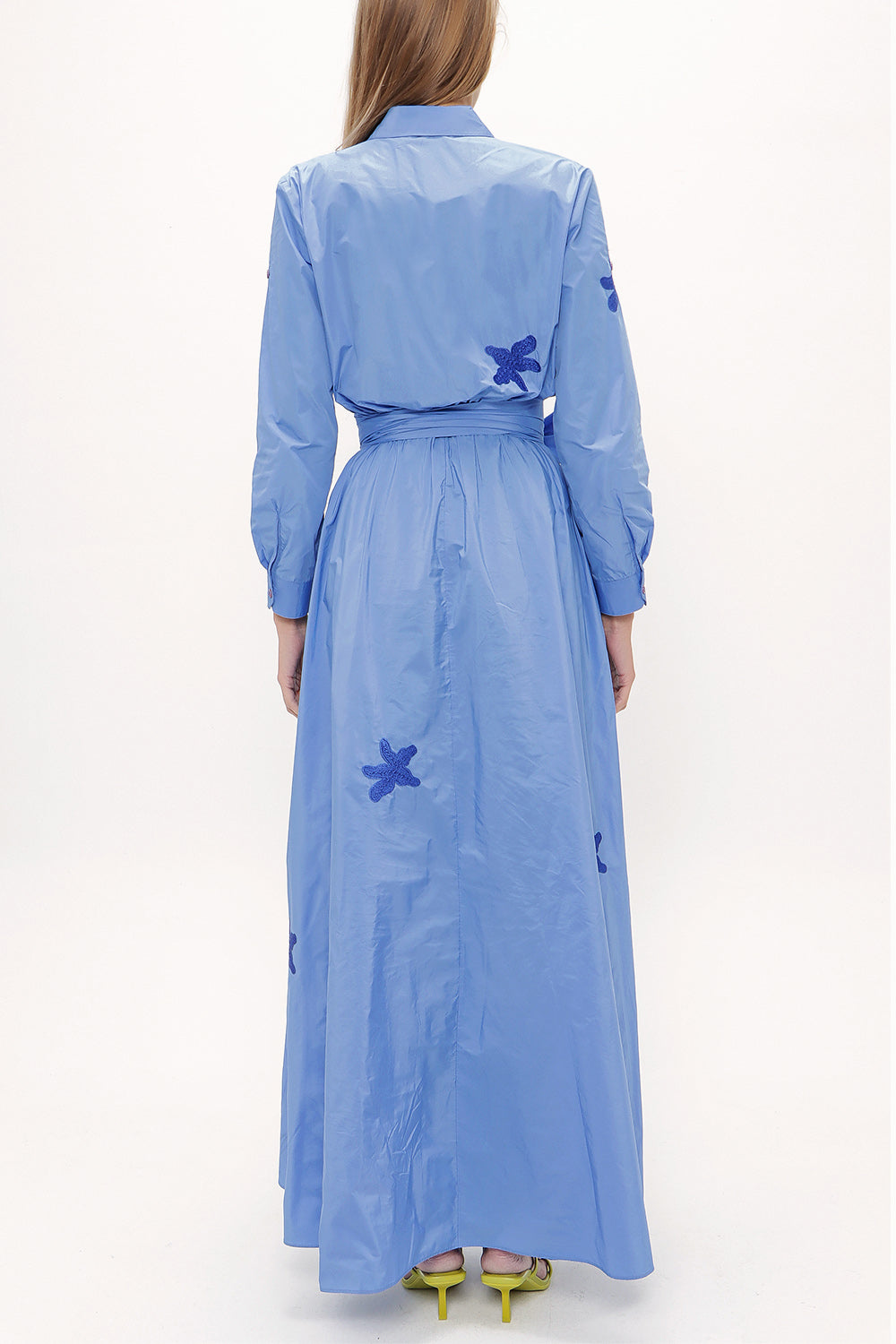 Mavi Nakışlı bağcıklı büzgülü uzun elbise 92917