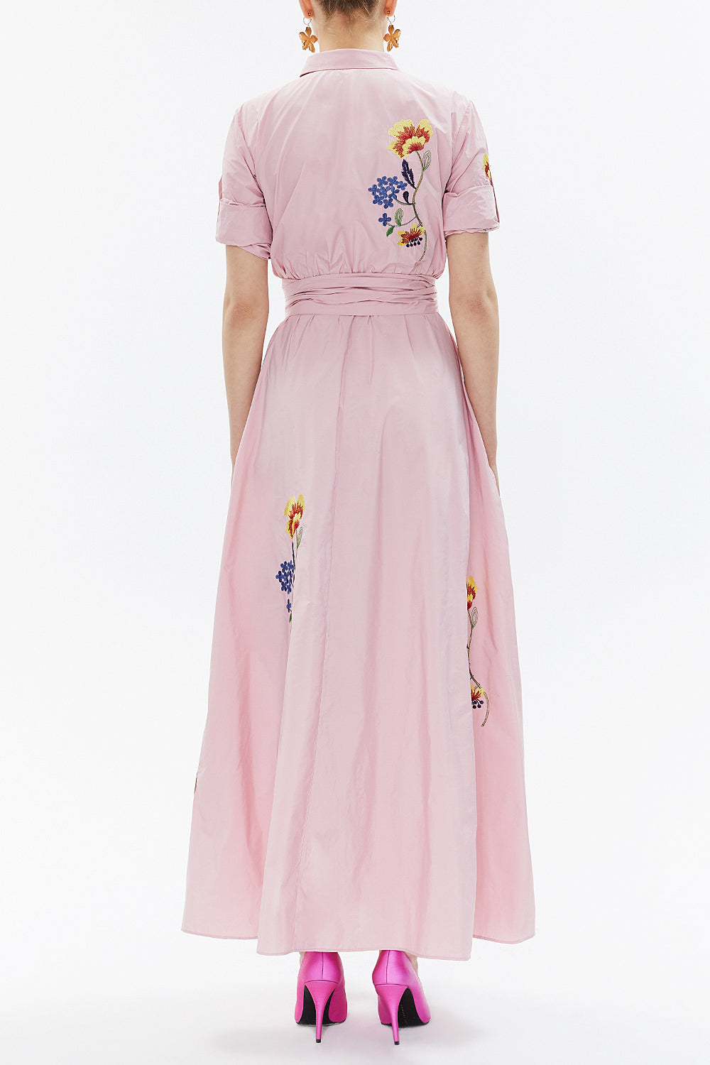 Pembe Nakışlı bağcıklı büzgülü uzun elbise 92917