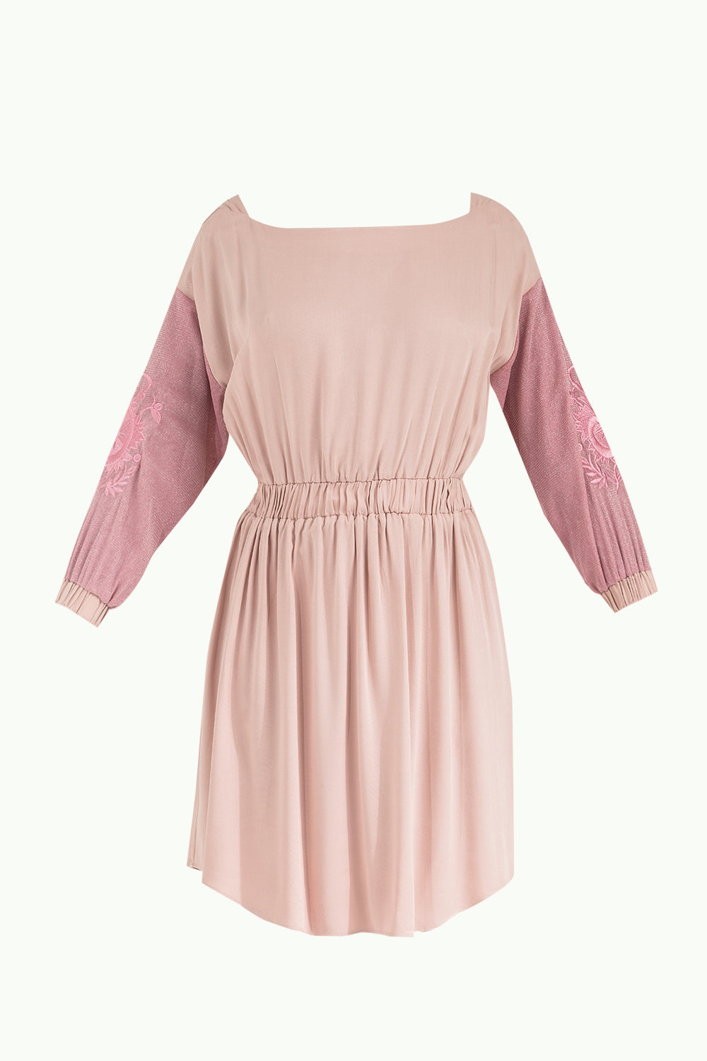 Pembe Nakışlı beli lastikli viskon mini elbise 92096