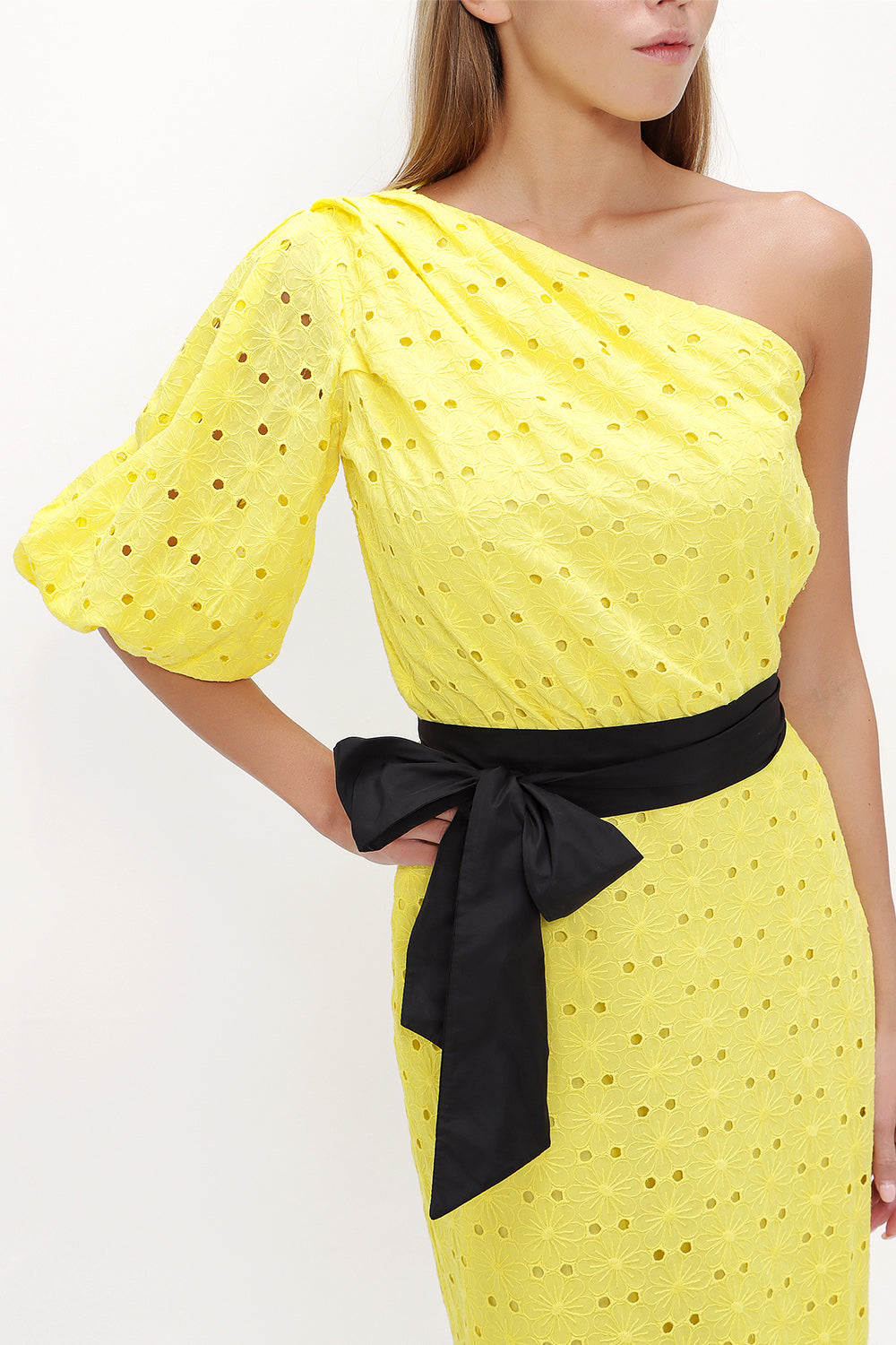 Sarı Tek omuz balon kollu midi elbise 92771