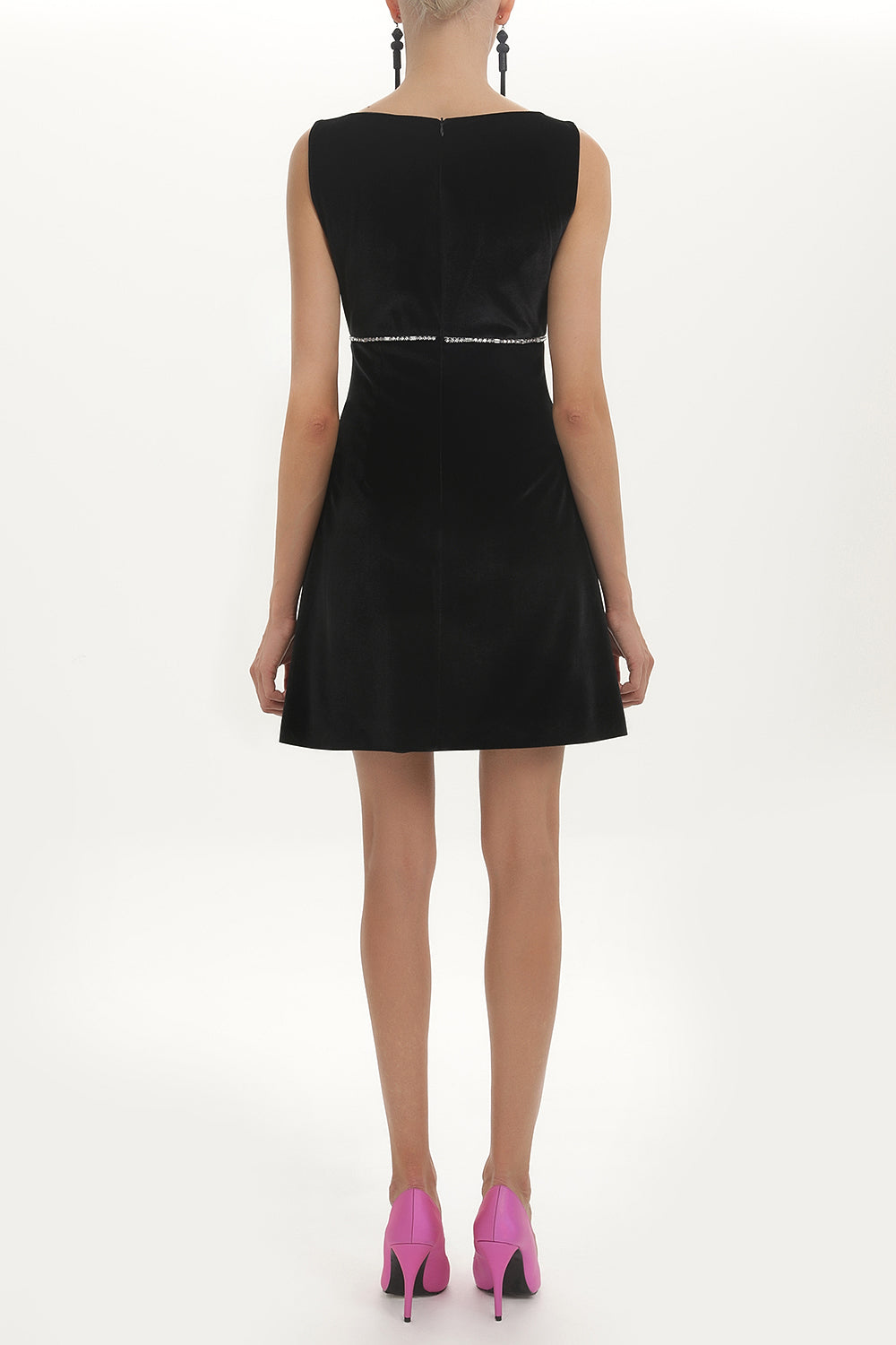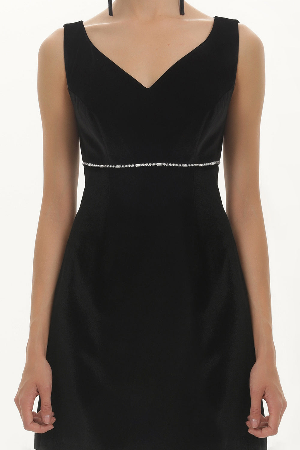 Siyah Beli taşlı v yaka kadife mini elbise 91522