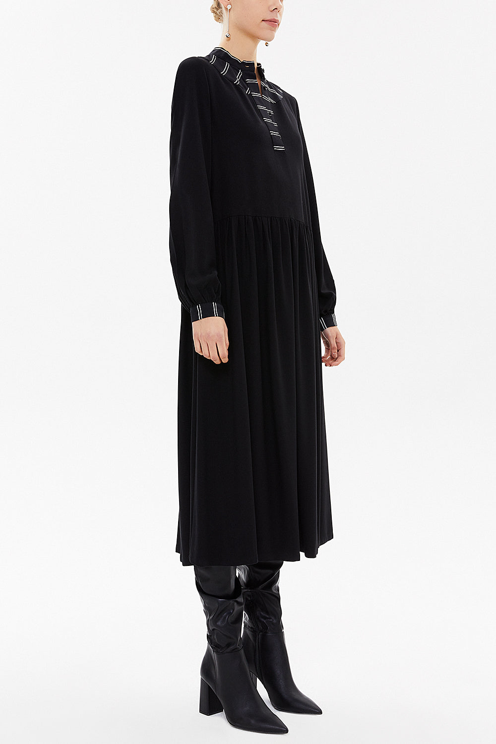 Siyah Desenli kumaş kombinli büzgülü midi elbise 92484