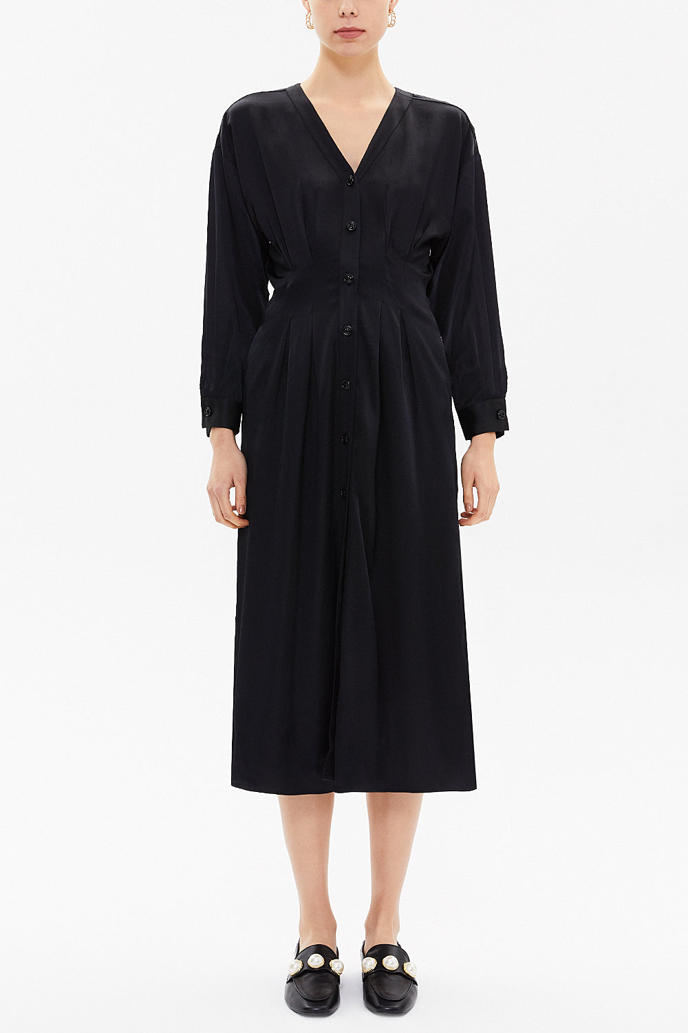 Siyah Düşük omuz V yaka düğmeli midi elbise 92613