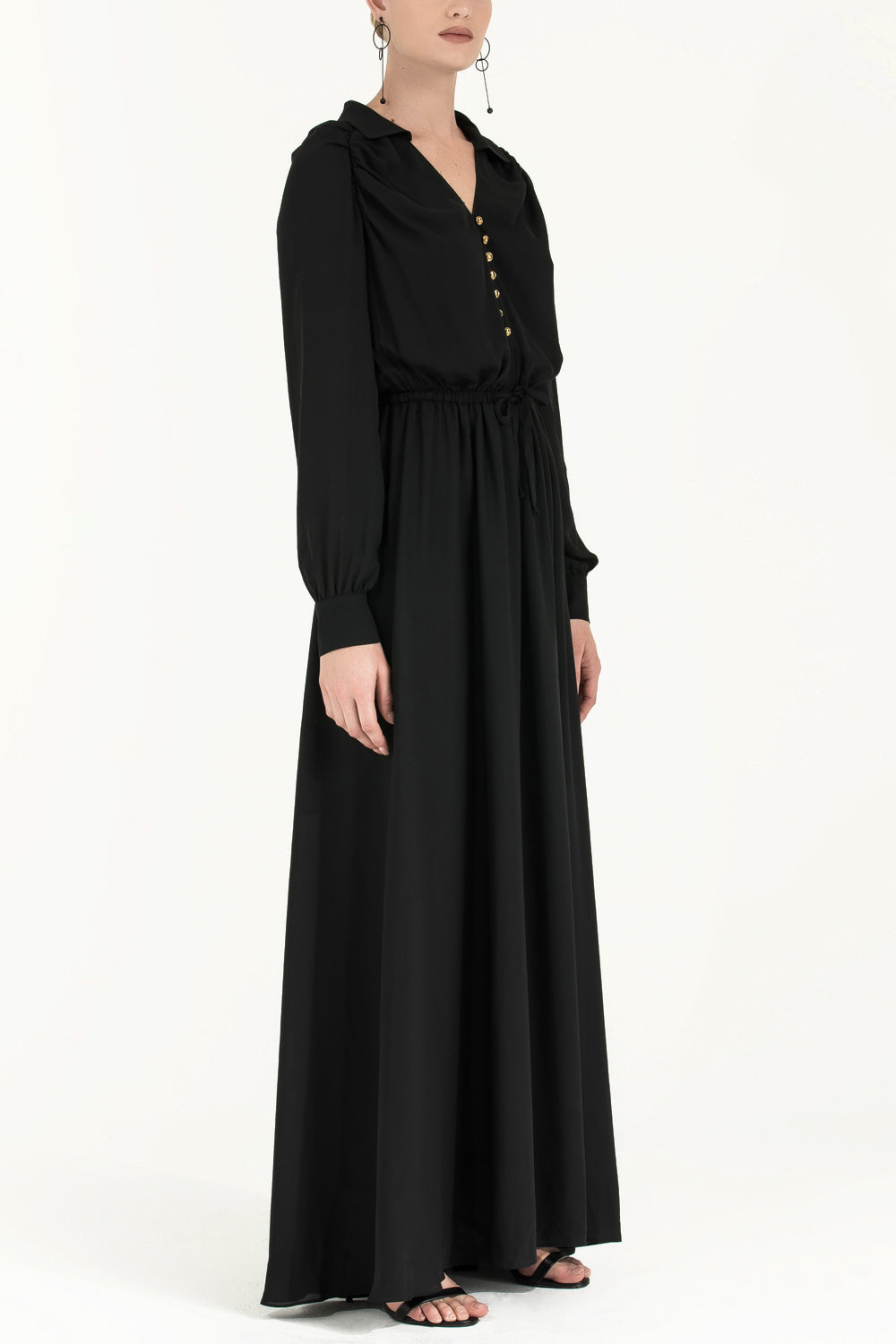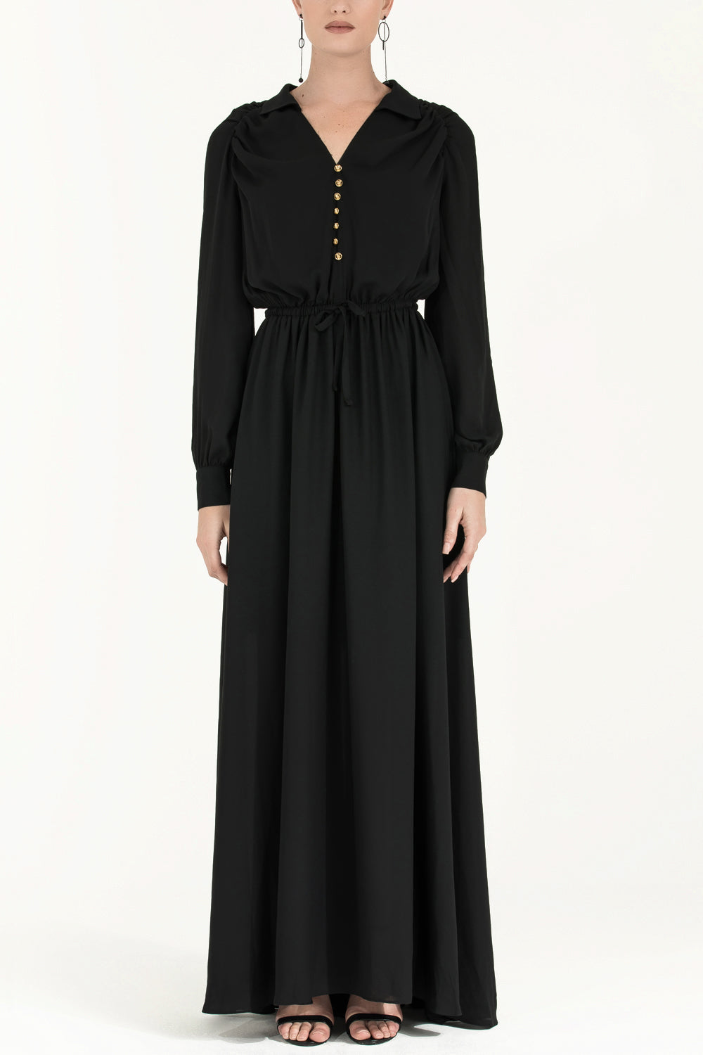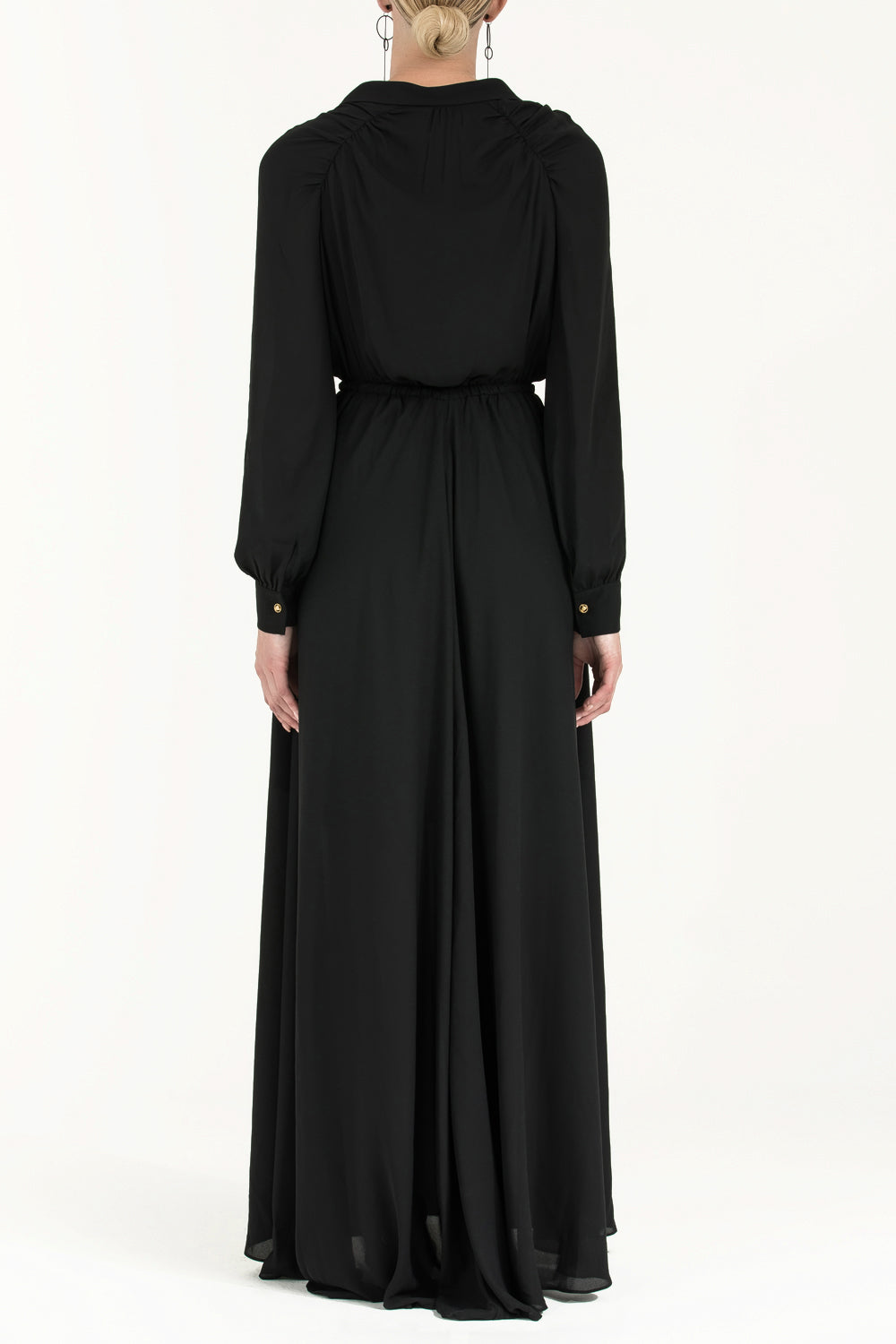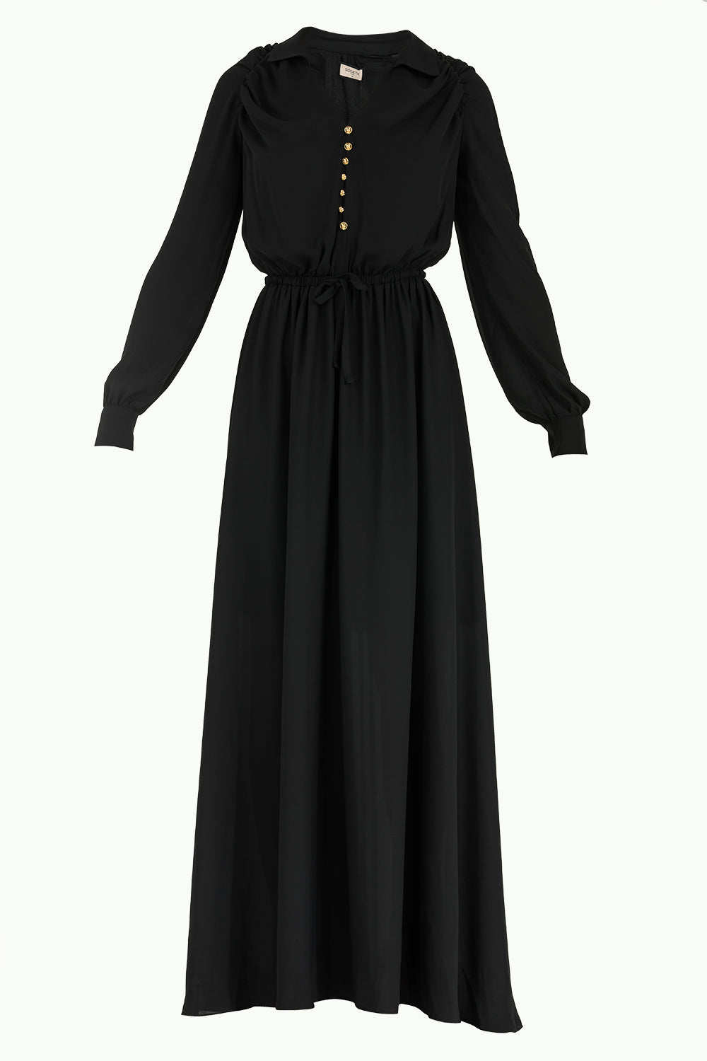 Siyah Omuzları büzgülü düğmeli uzun elbise 92251