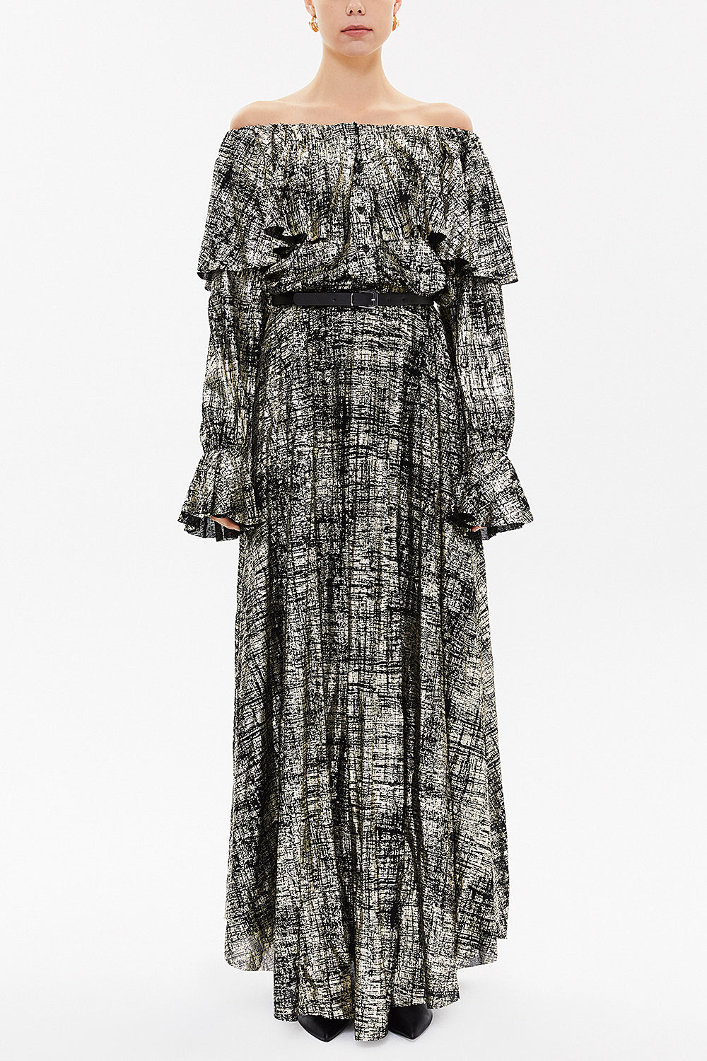 Siyah Omuzu lastikli ve kemerli uzun elbise 92518