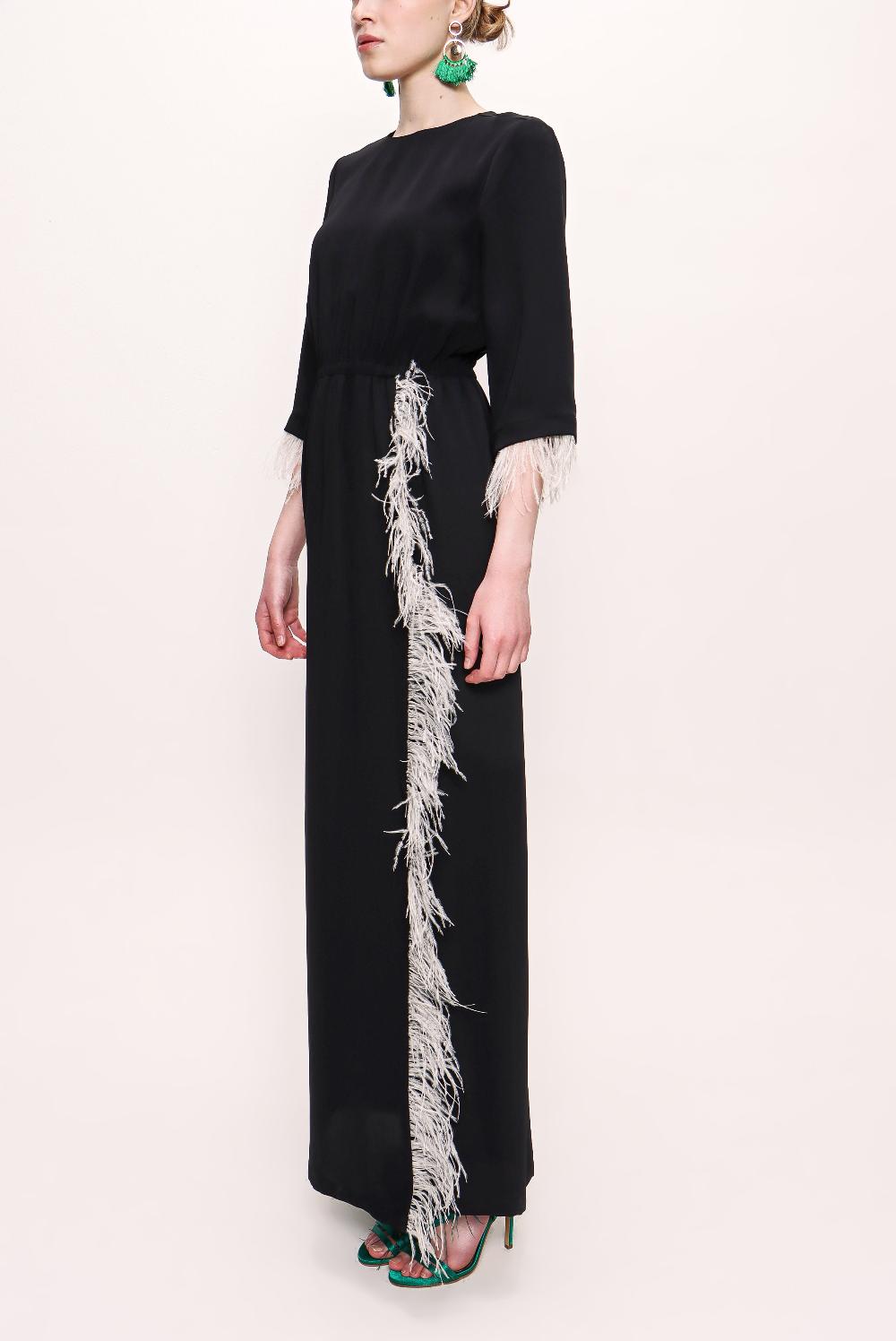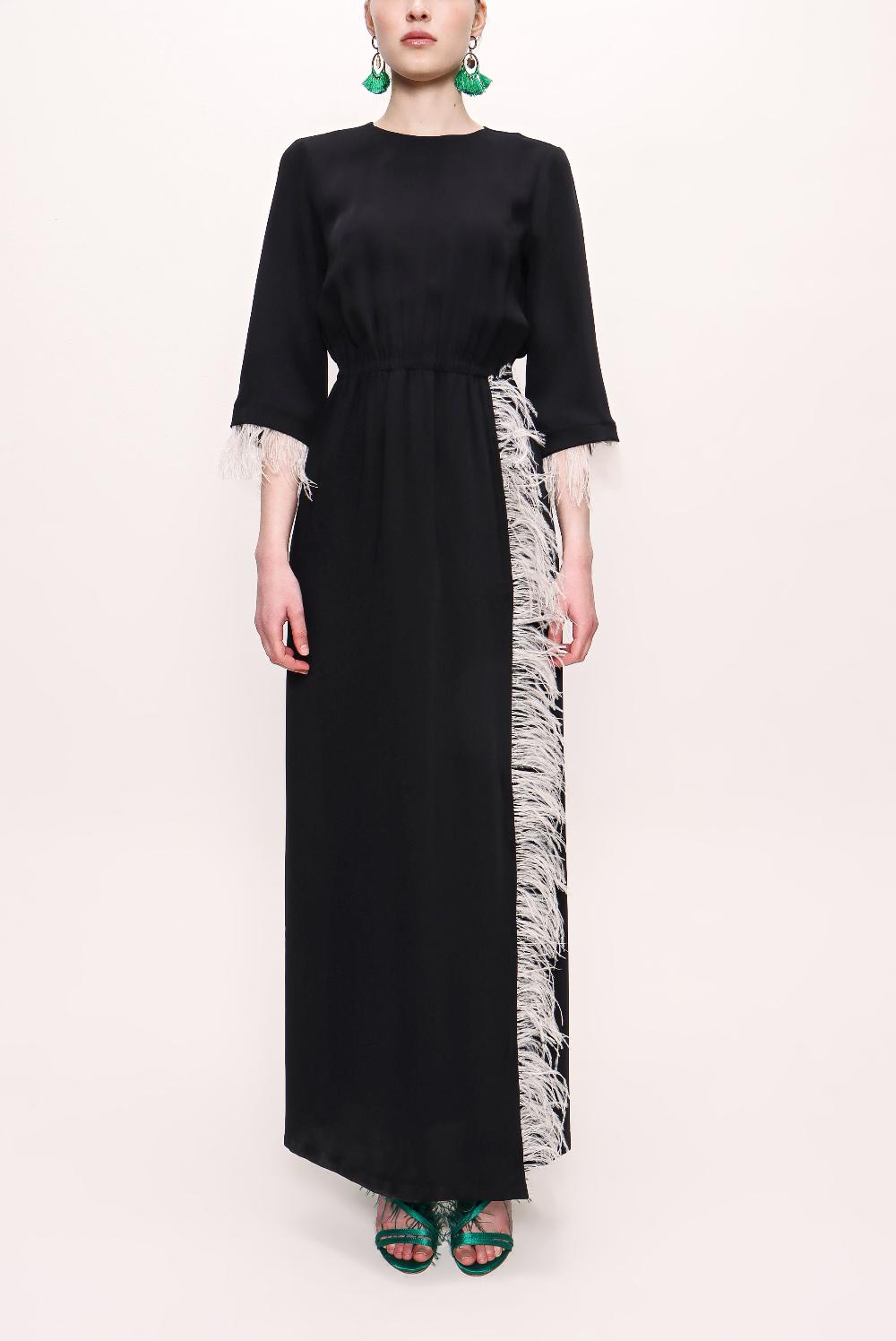 Siyah Yırtmaçlı ve tüy detaylı uzun elbise 92575