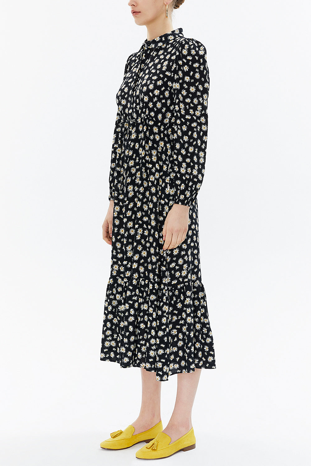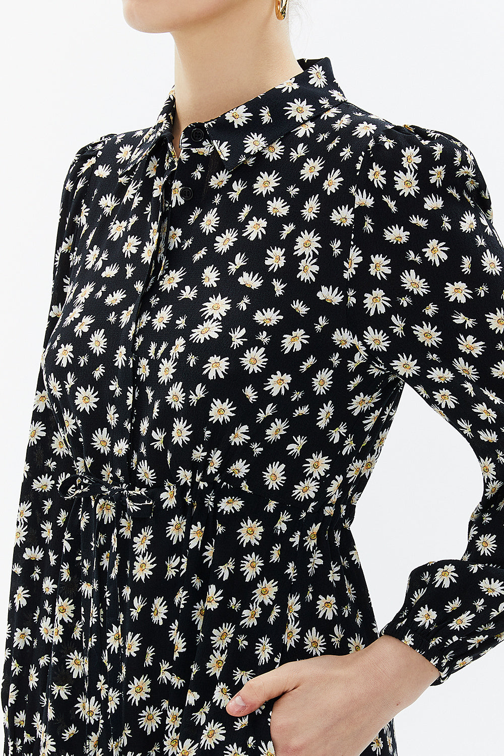 Siyah Zemin Çiçek Baskılı Büzgülü kemer detaylı midi elbise 93323