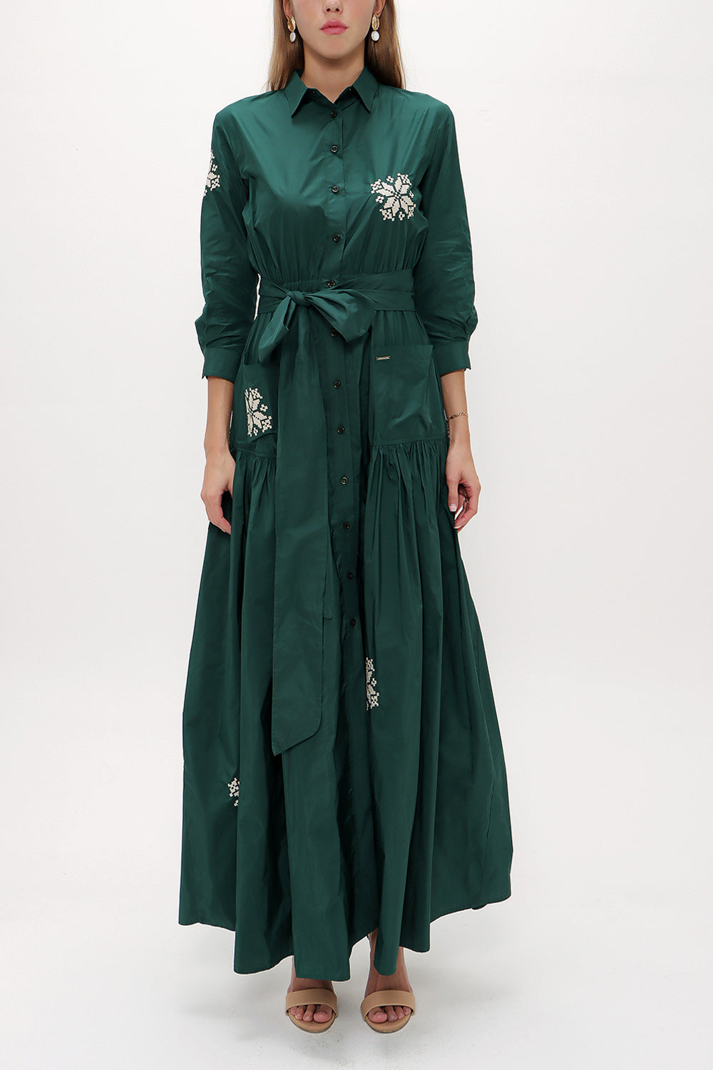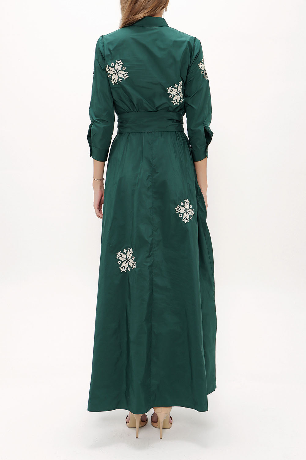 Yeşil Nakışlı ve büzgülü uzun elbise 92605